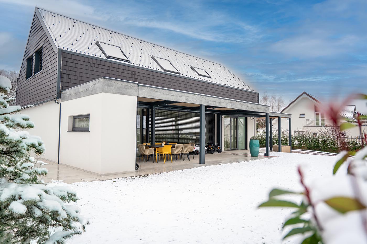The pergola features 190 mm wide louvers with internal structural reinforcements, allowing precise microclimate control.