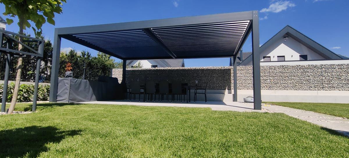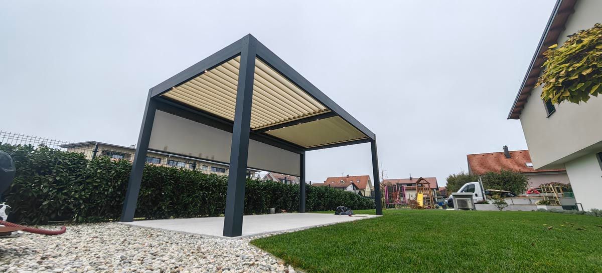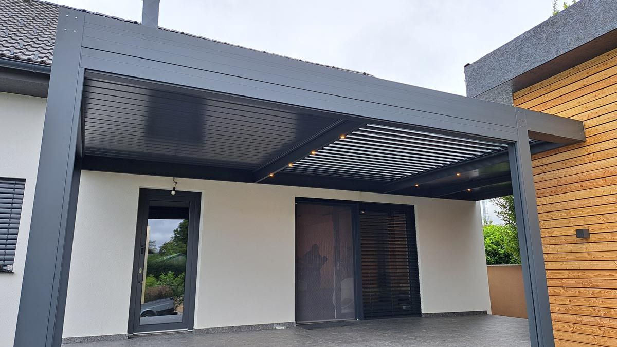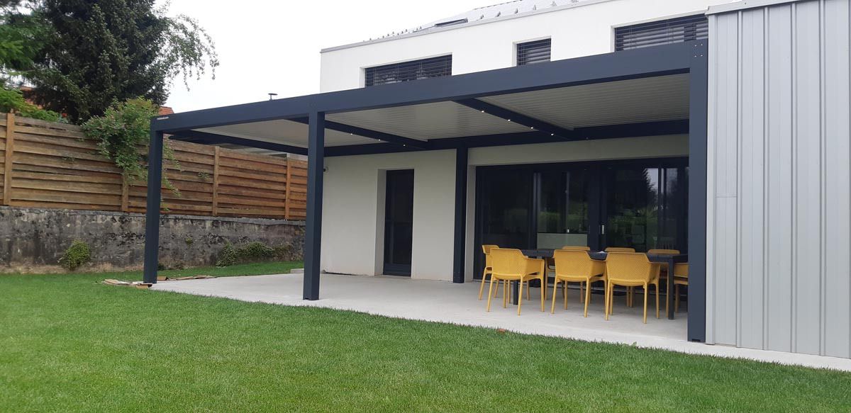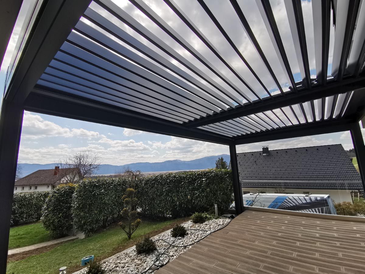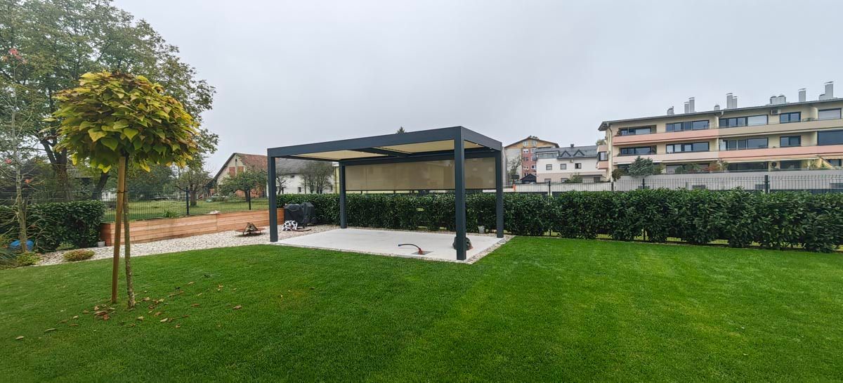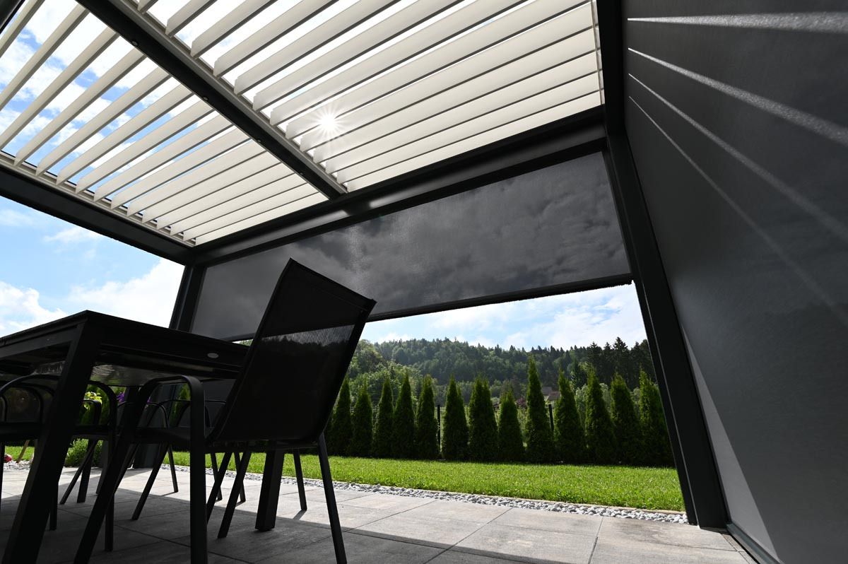 Bioklimatska pergola v elegantni antracit barvi (RAL 7016). S svojo preprosto in hkrati dovršeno zasnovo ponuja udobno zavetje za bivanje na prostem v vseh letnih časih.
