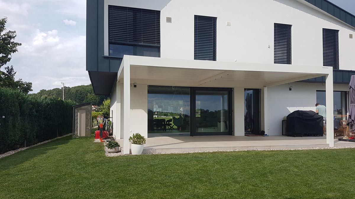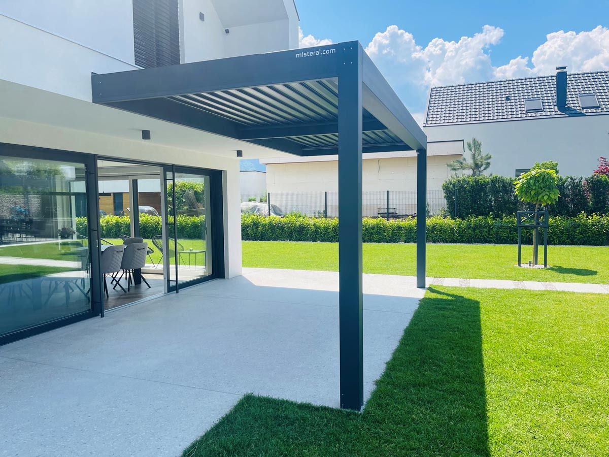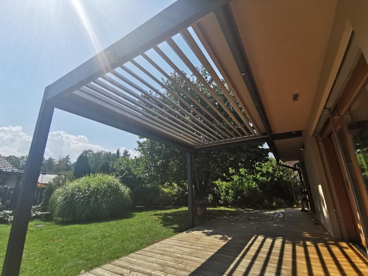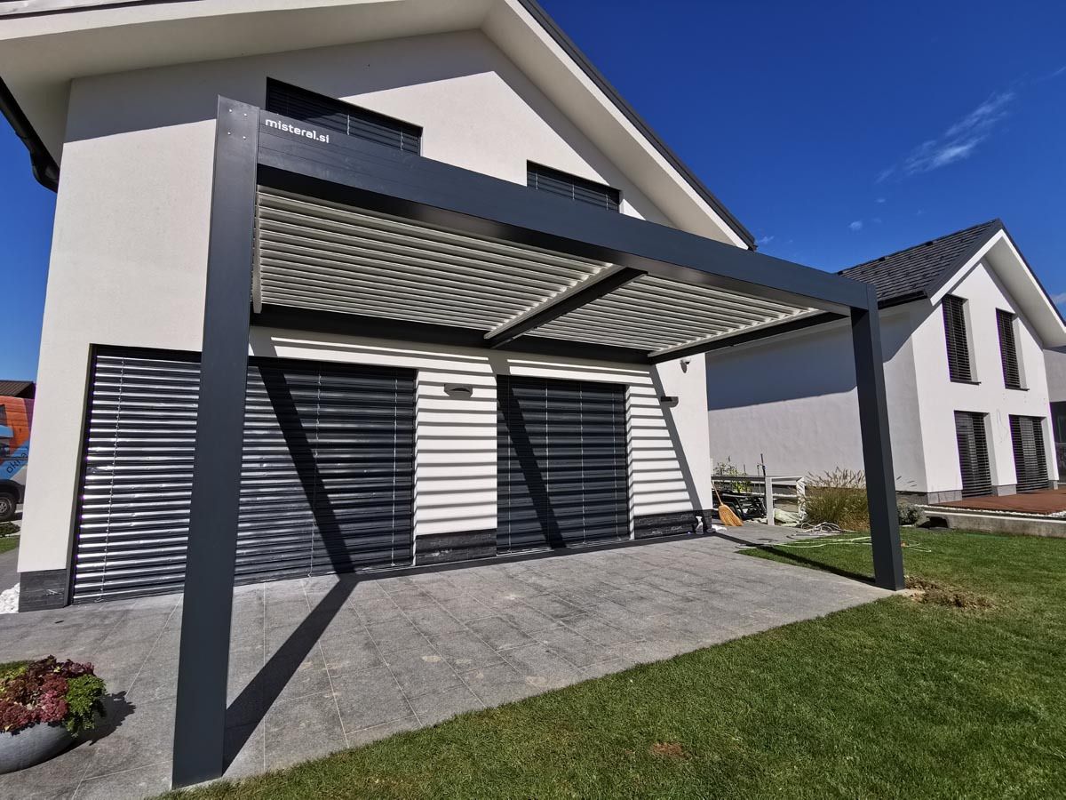 Na terasi pred hišo je postavljena bioklimatska pergola v kombinaciji antracit konstrukcije (RAL 7016) in belih lamel (RAL 9010), katera ustvarja prijeten zunanji prostor za bivanje v vseh vremenskih pogojih.