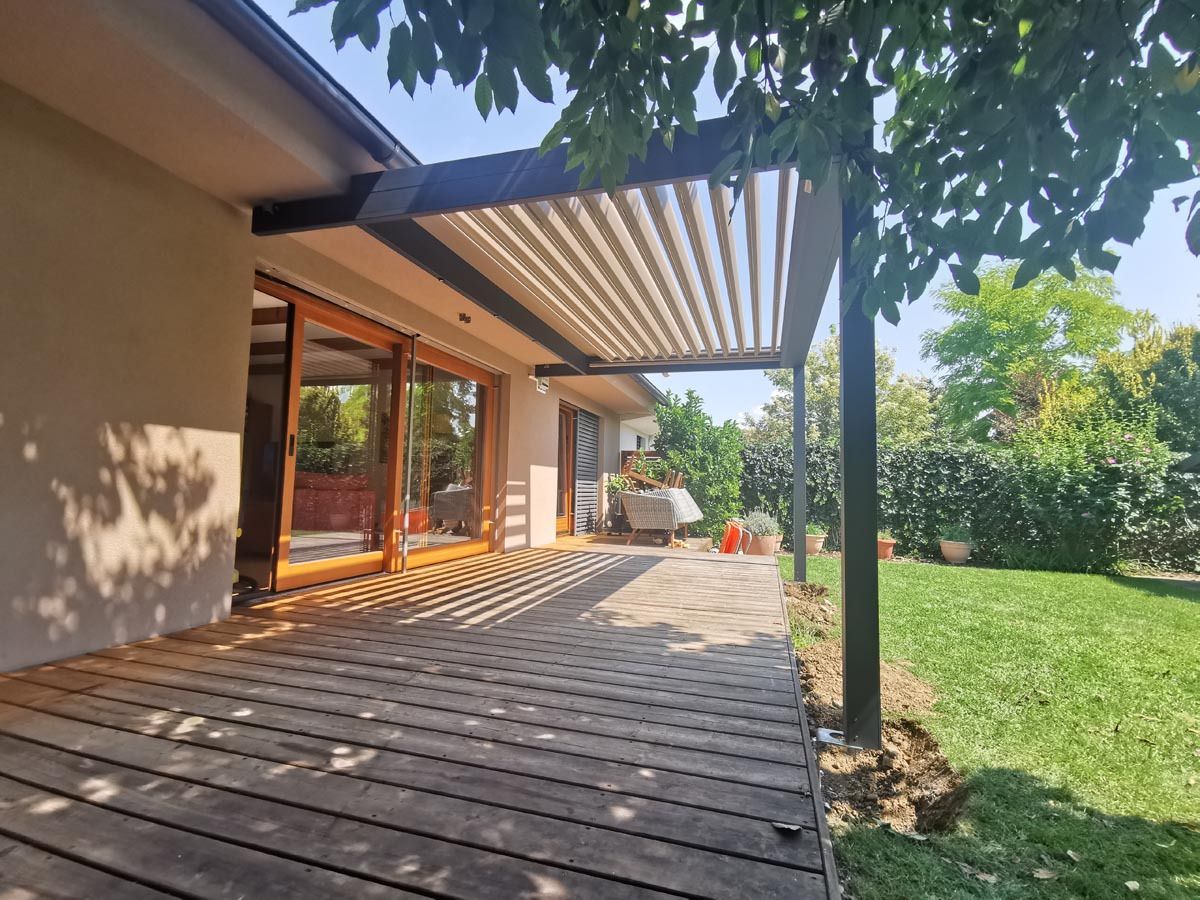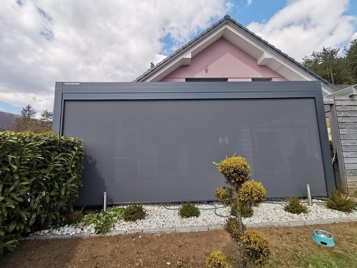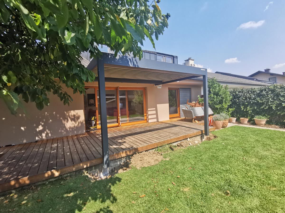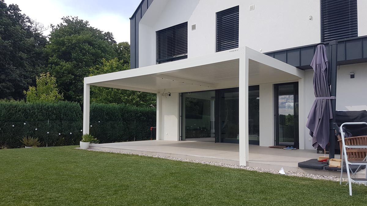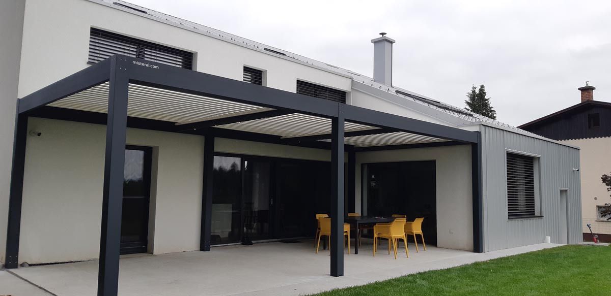 Na terasi pred hišo je postavljena bioklimatska pergola v kombinaciji antracit konstrukcije (RAL 7016) in belih lamel (RAL 9010), katera ustvarja prijeten zunanji prostor za bivanje v vseh vremenskih pogojih.