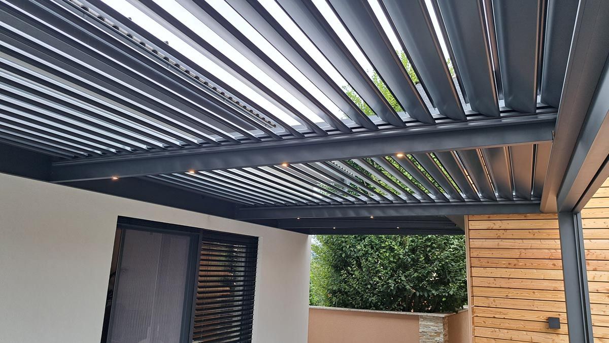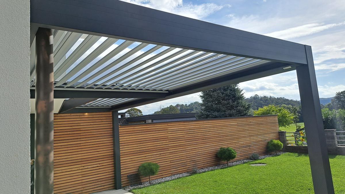 Na vrtu oz terasi v Domžalah stoji bioklimatska pergola, ki s svojo dovršeno zasnovo in izborom barv predstavlja popoln dodatek za udobno bivanje na prostem v vseh letnih časih. Antracit konstrukcija (RAL 7016) v kombinaciji z lamelami v topli bež barvi (RAL 1019) ustvarja prijeten kontrast.
