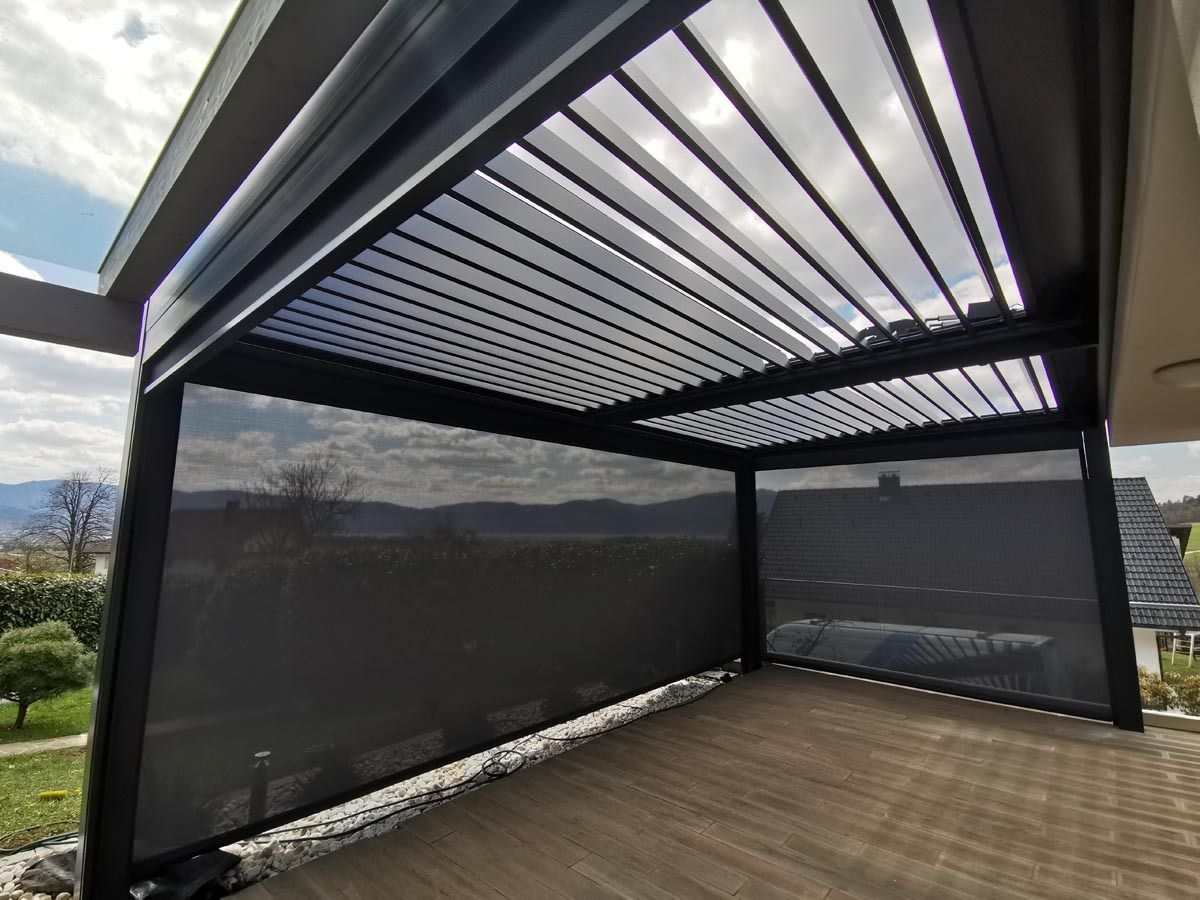 Za dodatno zaščito in večje udobje so na pergolo nameščeni trije ZIP screen roloji v antracit odtenku, ki učinkovito ščitijo pred soncem, vetrom in radovednimi pogledi, hkrati pa omogočajo zračen in svetel prostor tudi, ko so spuščeni. Vgrajene LED luči diskretno osvetljujejo prostor pod pergolo in ustvarjajo prijetno atmosfero v večernih urah.