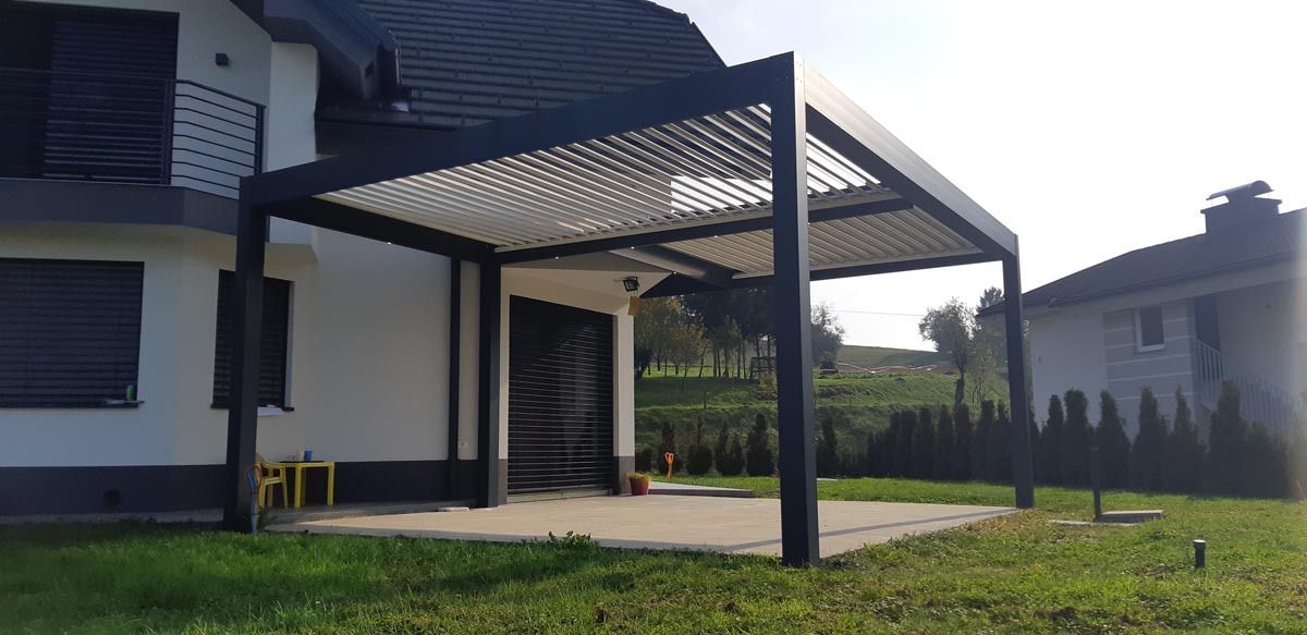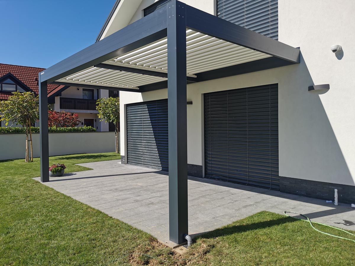 Bioklimatska pergola v antracit konstrukciji (RAL 7016) z belimi lamelami (RAL 9010).