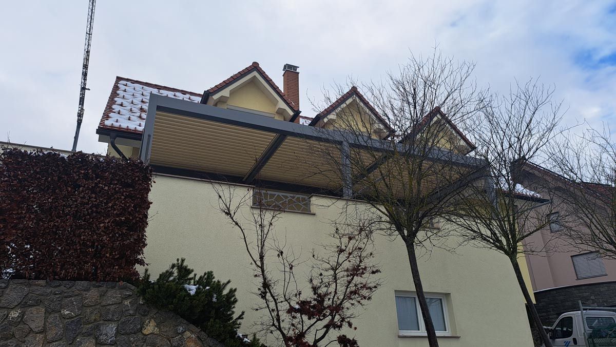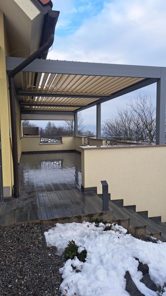 Na balkonu oz. terasi stanovanjske hiše je postavljena večja bioklimatska pergola, ki združuje funkcionalnost in estetsko dovršenost. Izvedena je v elegantni kombinaciji antracit konstrukcije (RAL 7016) in lamel v toplem bež odtenku RAL 1019, kar ustvarja prijetno, sodobno barvno harmonijo z objektom.