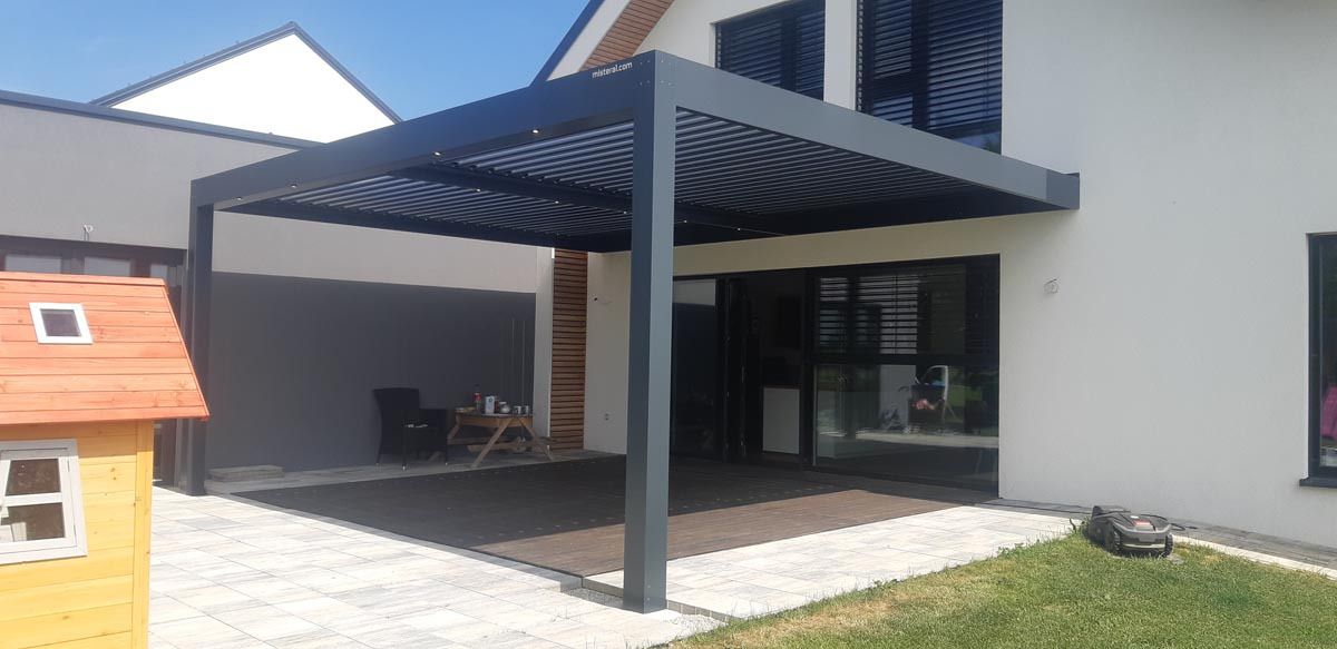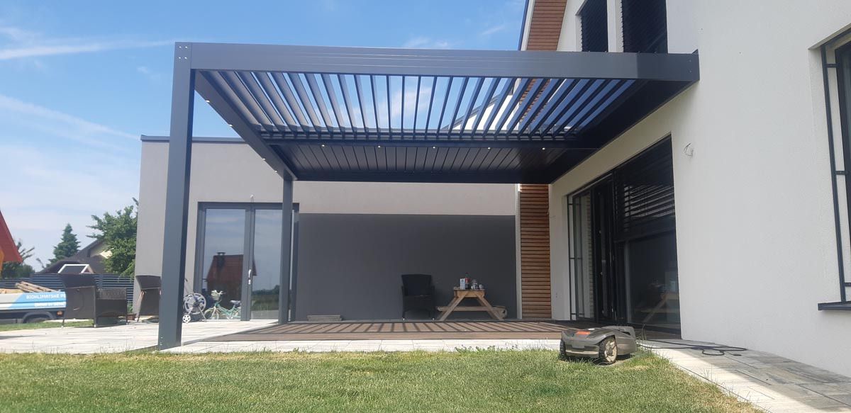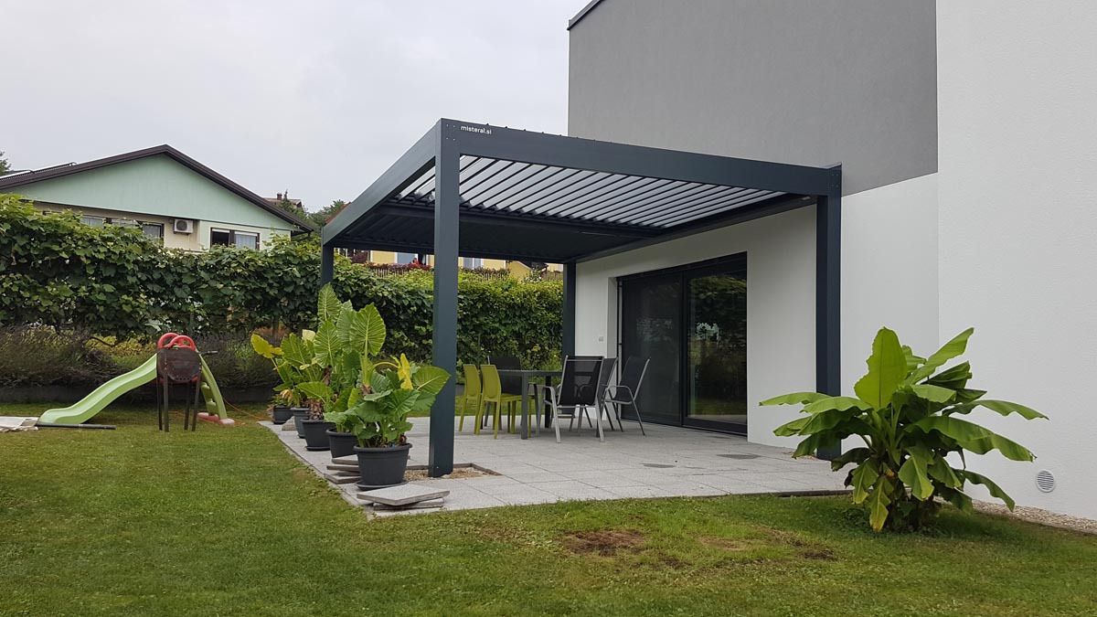 Na terasi sodobne novogradnje stoji elegantna bioklimatska pergola v antracit barvi (RAL 7016), ki se odlično poda k hiši in ji daje sodoben, prefinjen videz.