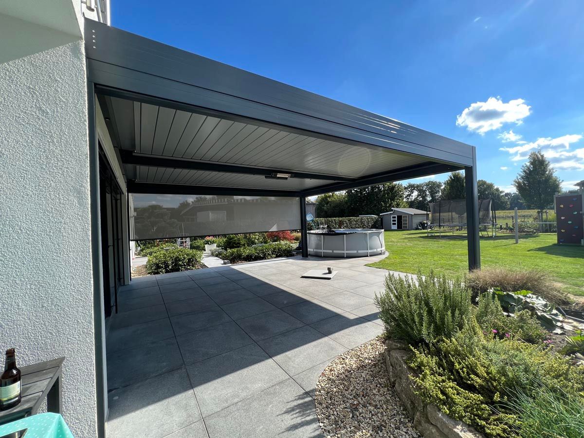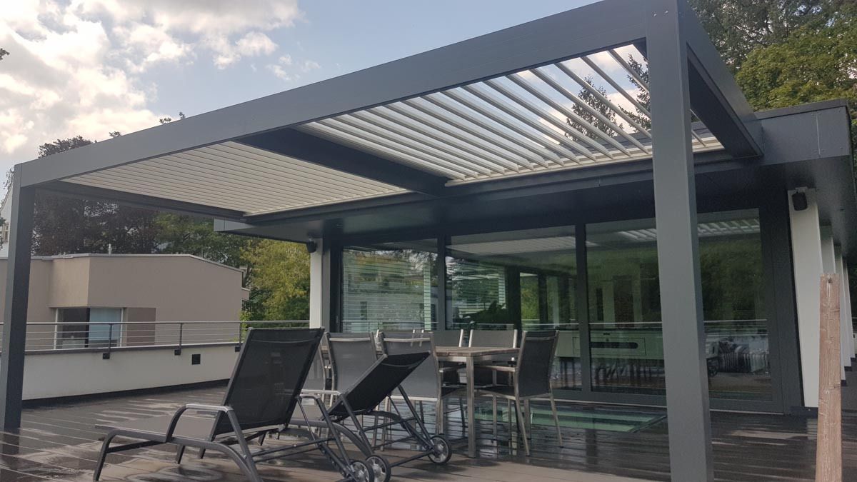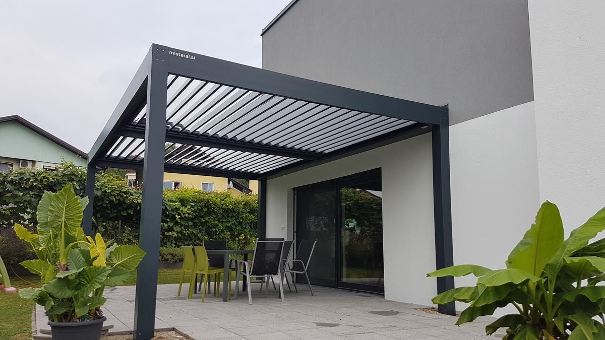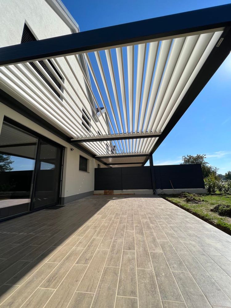 Bioklimatska pergola v elegantni antracit barvi (RAL 7016), ki se popolnoma ujema z arhitekturo objekta.