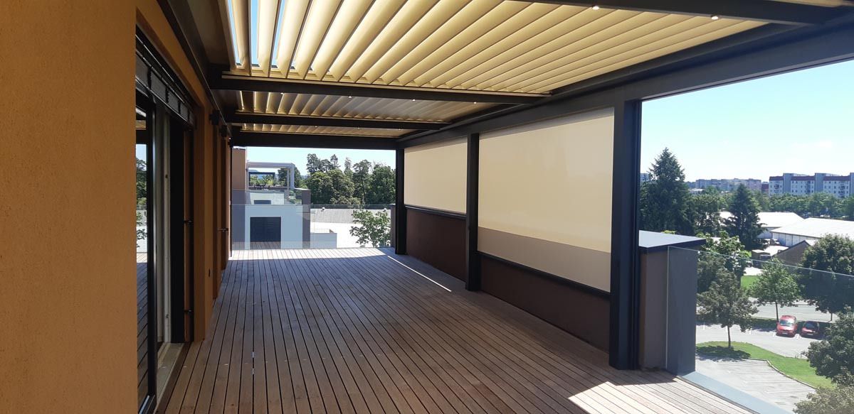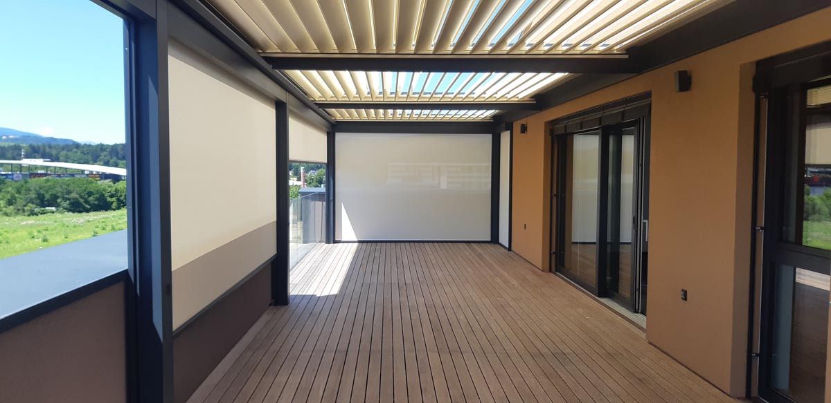 Rezultat je elegantna in funkcionalna rešitev, ki balkonski terasi dodaja prijeten, zaščiten zunanji prostor za uživanje v vseh vremenskih pogojih.