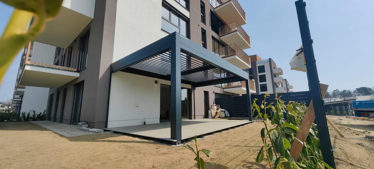 Na terasi večstanovanjskega objekta je postavljena pergola v kombinaciji antracit konstrukcije (RAL 7016) in lamel v bež barvi (RAL 1015). Ta barvna uskladitev ustvarja topel, sodoben videz, ki se lepo povezuje z arhitekturo objekta in hkrati izstopa kot estetski poudarek.