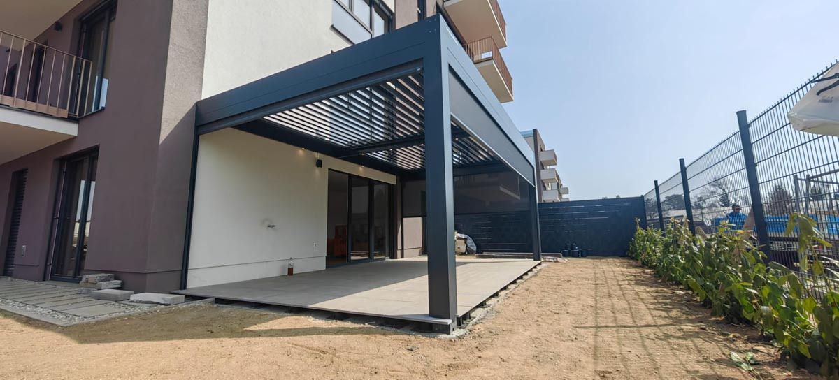 Bioklimatska pergola v antracit barvi (RAL 7016), ki je nameščena na atrijski terasi sodobnega stanovanjskega bloka.