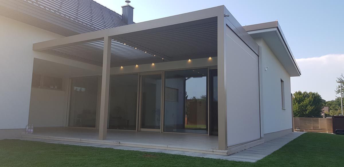 Na čudoviti novogradnji na Štajerskem stoji elegantna bioklimatska pergola v antracit barvi (RAL 7016), ki se s svojim sodobnim videzom odlično ujema z moderno arhitekturo hiše.