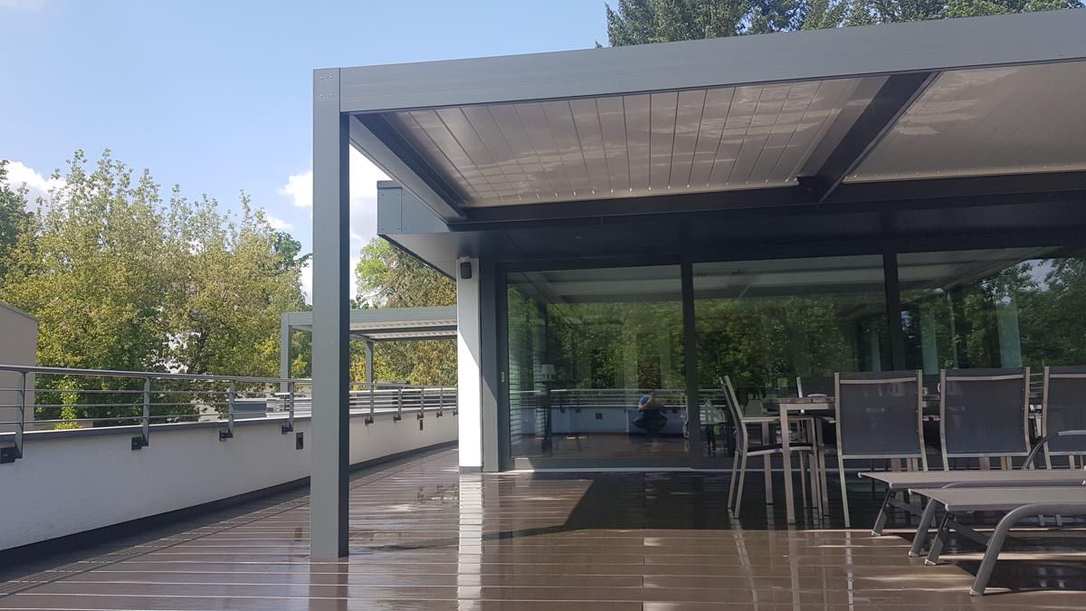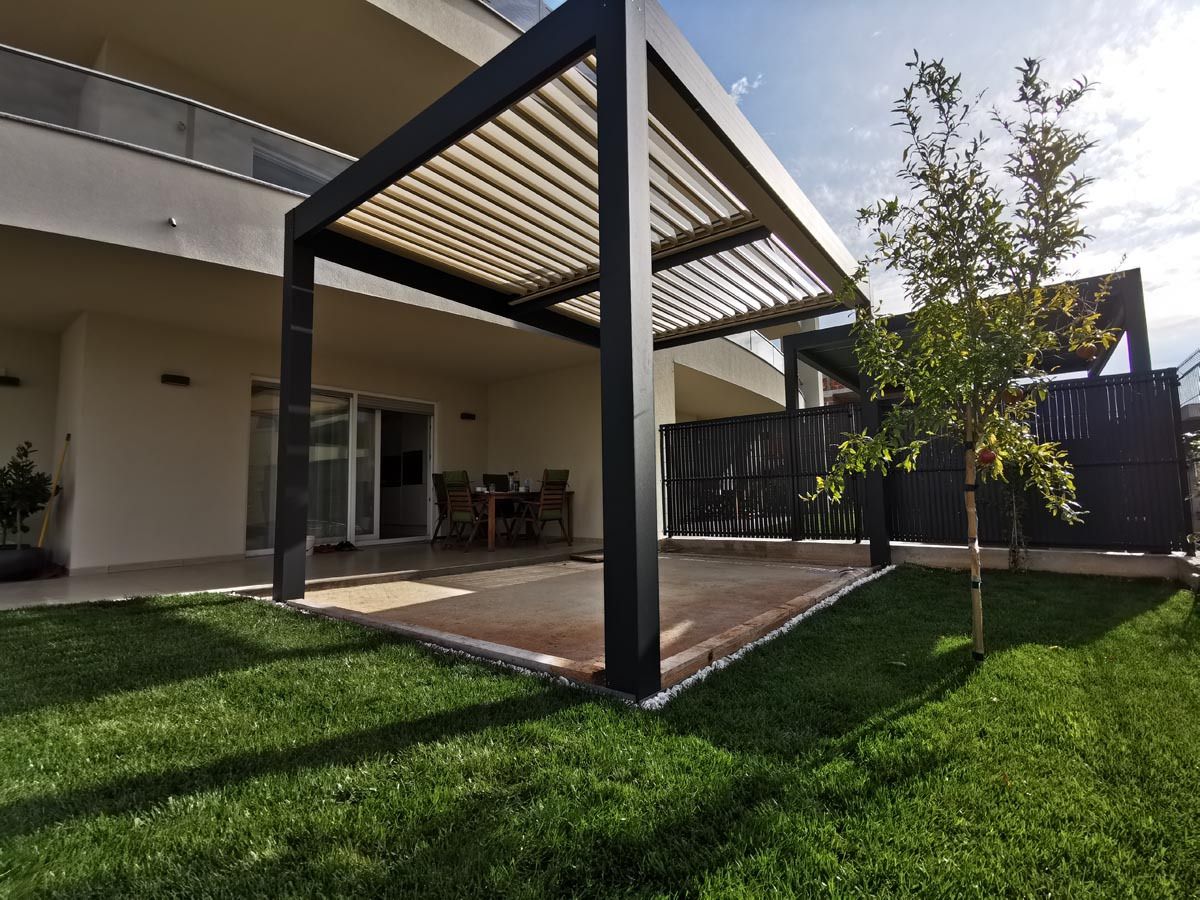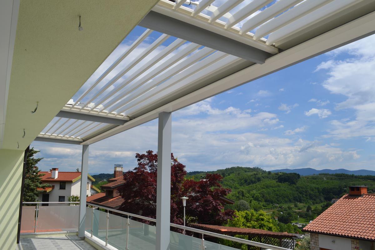 Pergola je zasnovana z dvema poljema vzporednih lamel, ki omogočata natančno regulacijo svetlobe in zračenja na celotni površini terase. Lamele so rotacijske in se lahko prilagajajo vremenskim razmeram – od odprtosti za sončne žarke do popolne zaščite pred dežjem.