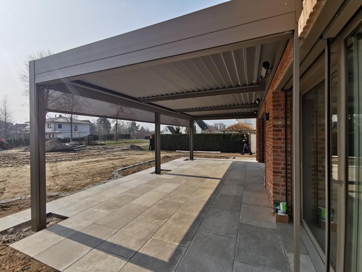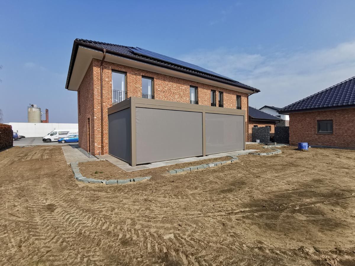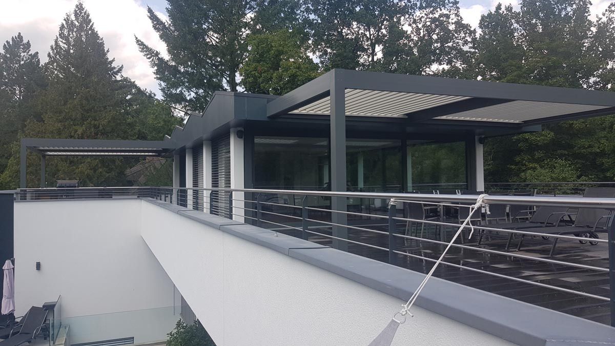 Na posebni gradnji v Nemčiji je nameščena pergola v unikatni peščeni barvi (RAL 9007), ki se elegantno ujema z arhitekturnim slogom objekta.