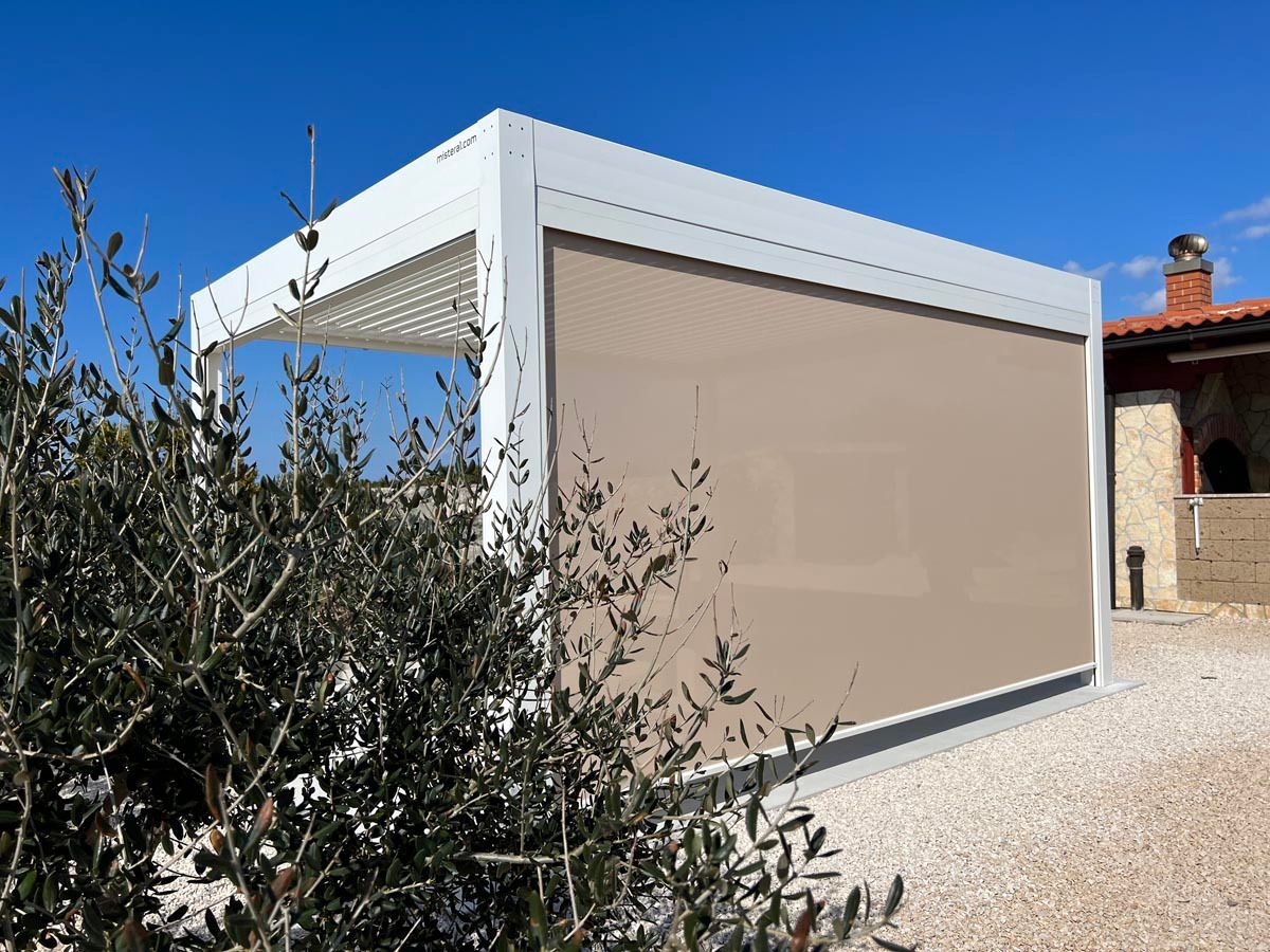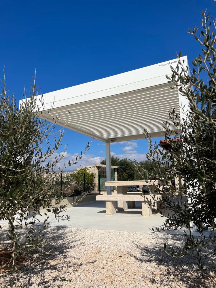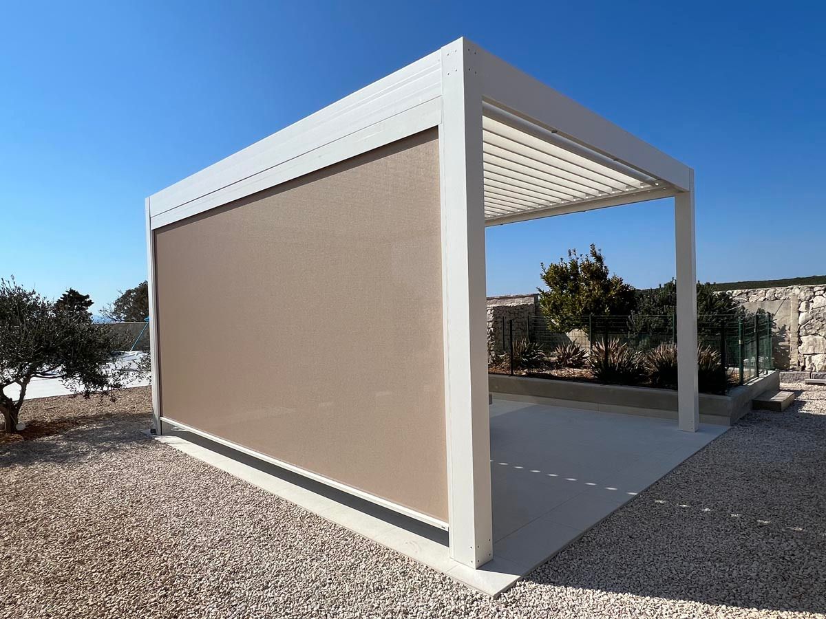 Na otoku Pagu stoji čudovita in elegantna pergola v beli barvi (RAL 9010), ki se popolnoma ujema z morsko okolico ter ustvarja lahkoten, svež in prestižen videz.