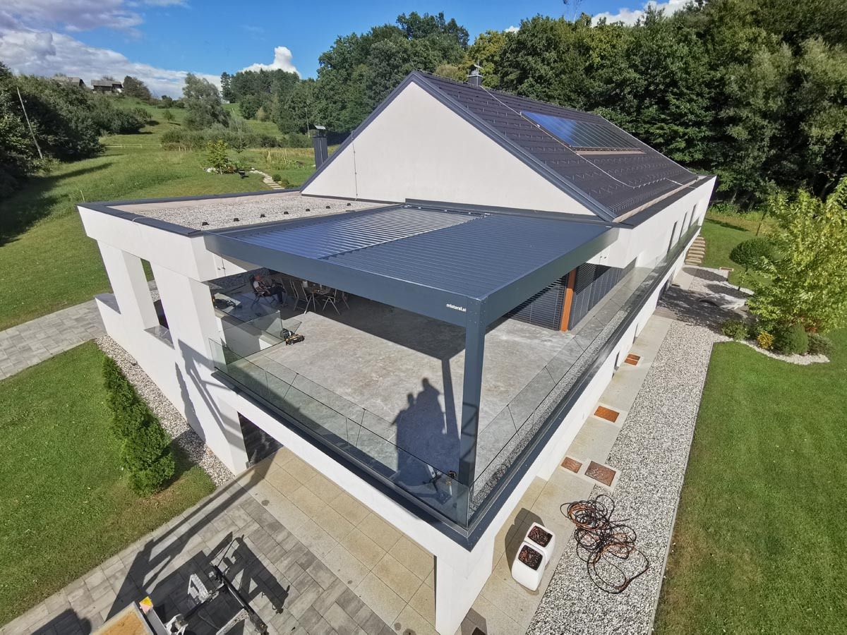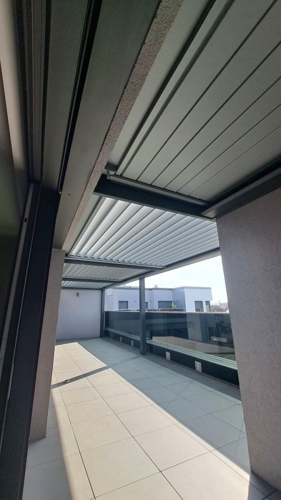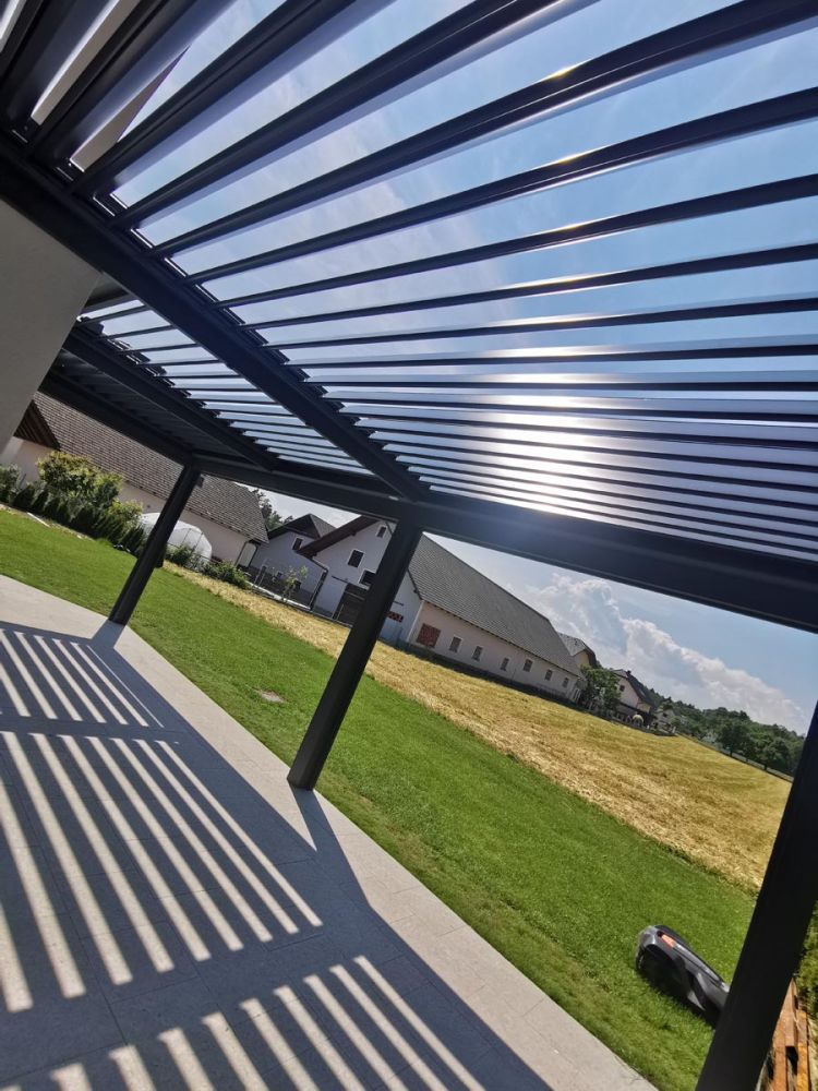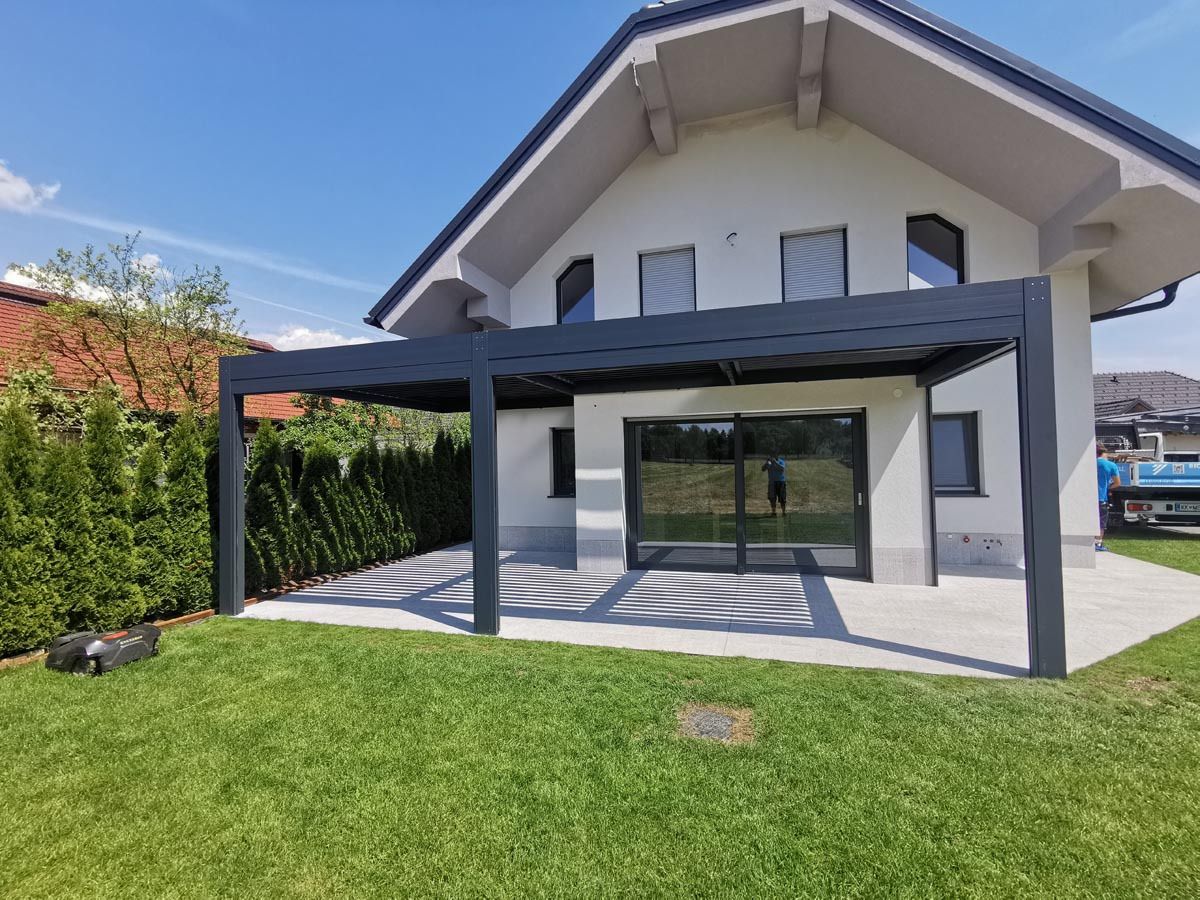 Na terasi te novogradnje je postavljena manjša, elegantna bioklimatska pergola, ki se popolno ujema z barvami hiše in celotno arhitekturo objekta. Konstrukcija je v antracit barvi (RAL 7016), lamele so bele (RAL 9010), kar ustvarja prefinjen kontrast in sodoben videz.