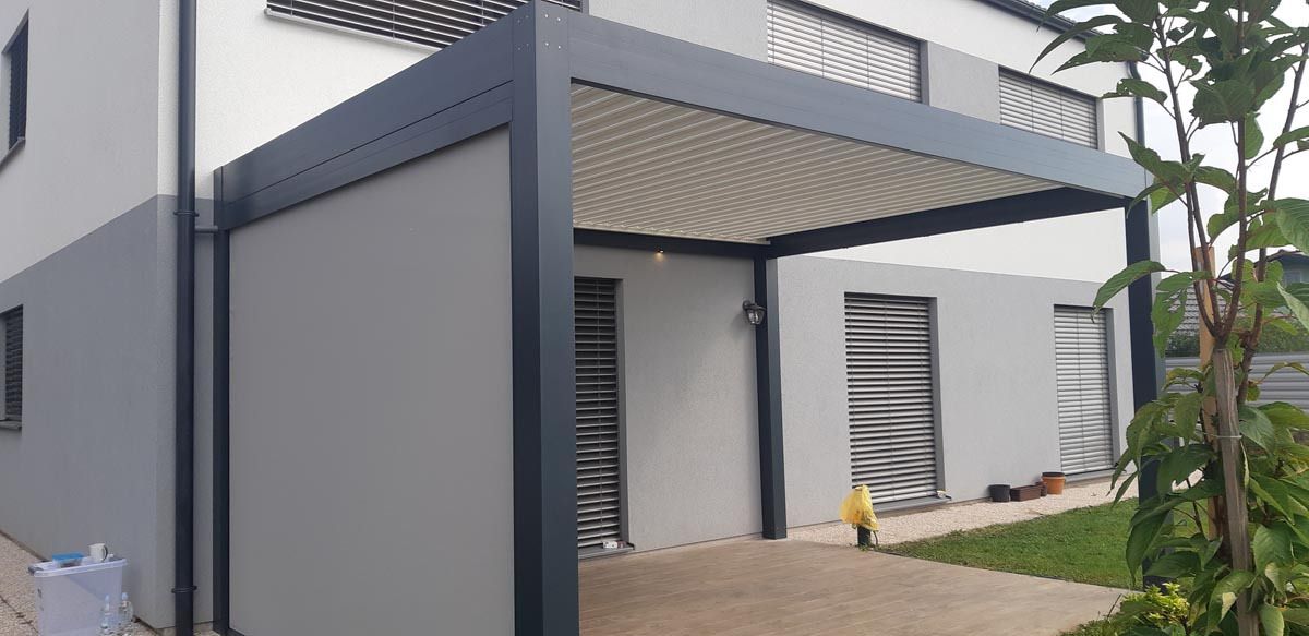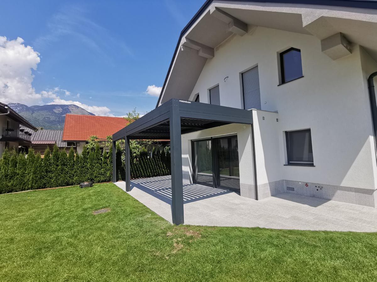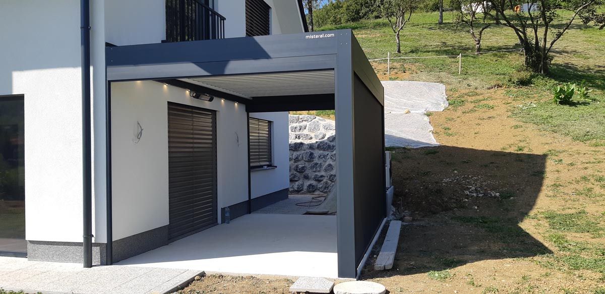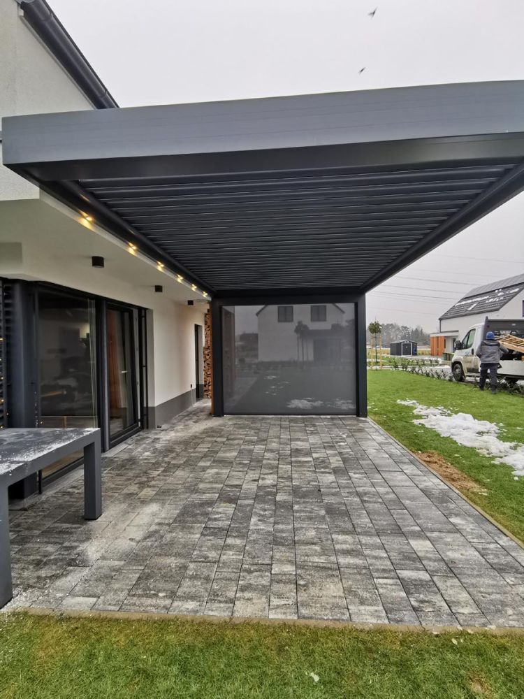 Na terasi te novogradnje je postavljena manjša, elegantna bioklimatska pergola, ki se popolno ujema z barvami hiše in celotno arhitekturo objekta. Konstrukcija je v antracit barvi (RAL 7016), lamele so bele (RAL 9010), kar ustvarja prefinjen kontrast in sodoben videz.