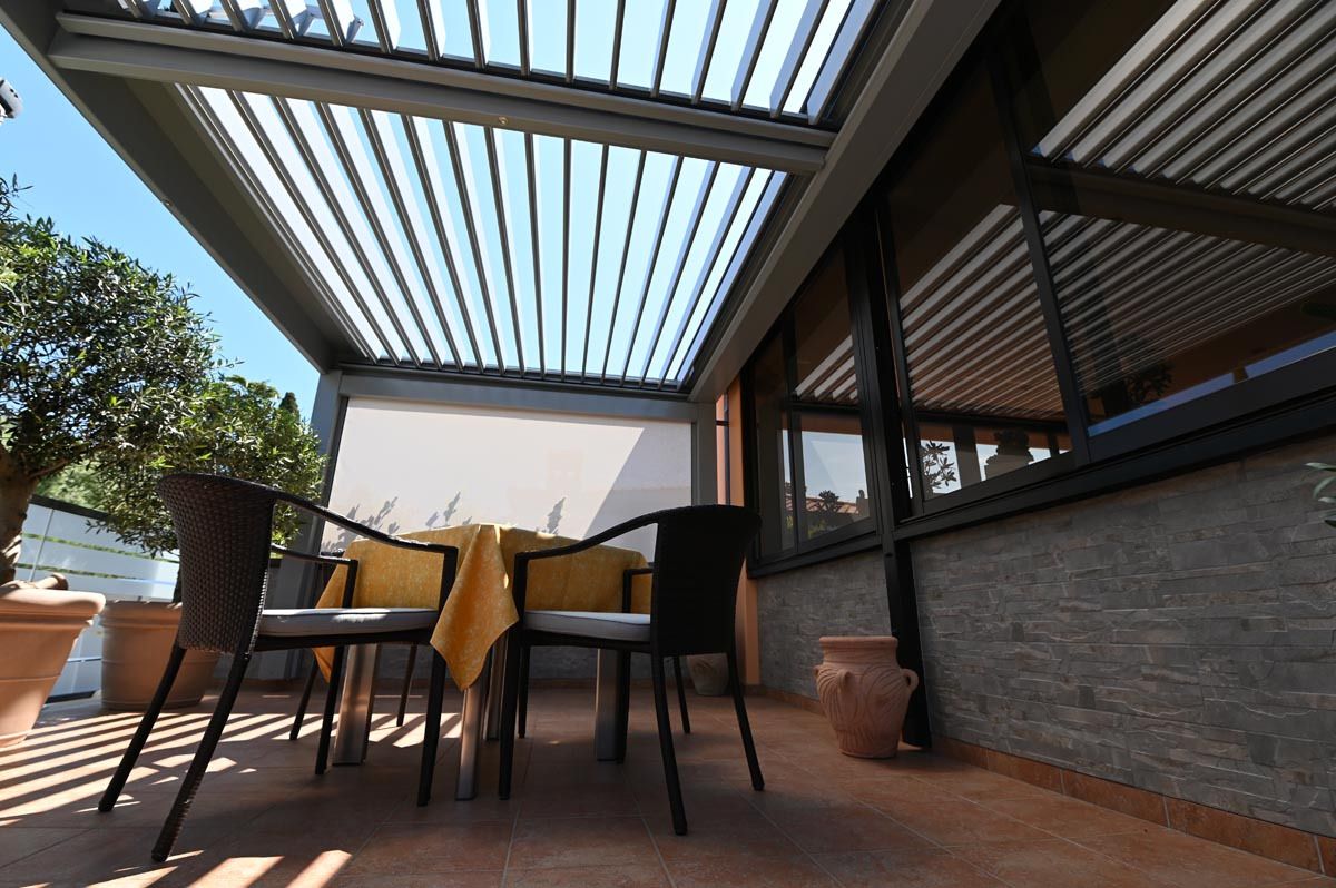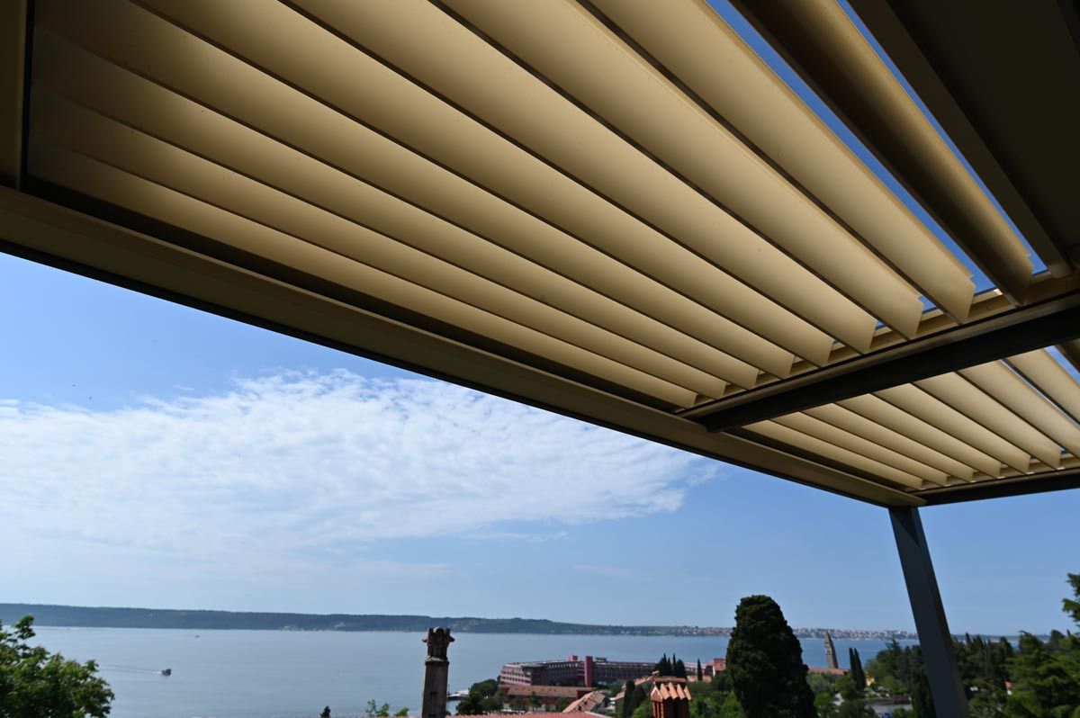 Na terasi gostinskega lokala v apartmajski hiši v Portorožu stoji bioklimatska pergola v elegantnem srebrnem odtenku RAL 9006, ki prostoru daje moderen in prestižen videz.