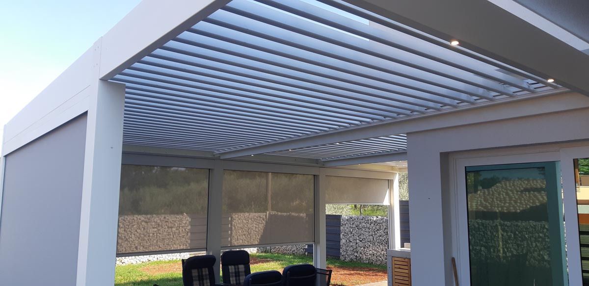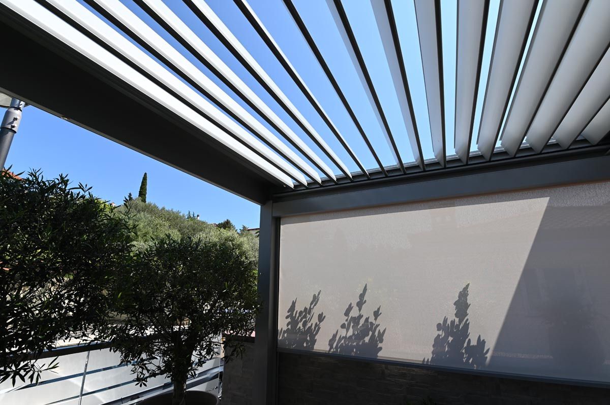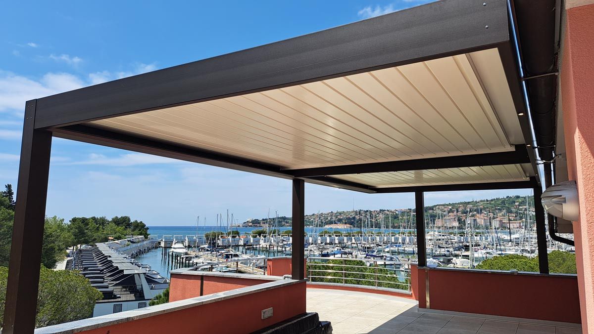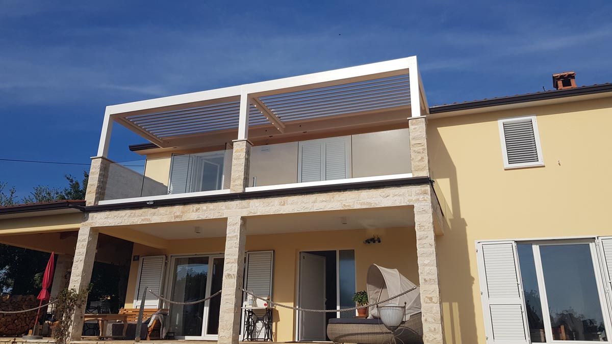 Na balkonski terasi v Rovinju je nameščena pergola v elegantni beli barvi (RAL 9010), ki prostoru daje svežino in lahkotnost ter se odlično poda obmorskemu okolju.