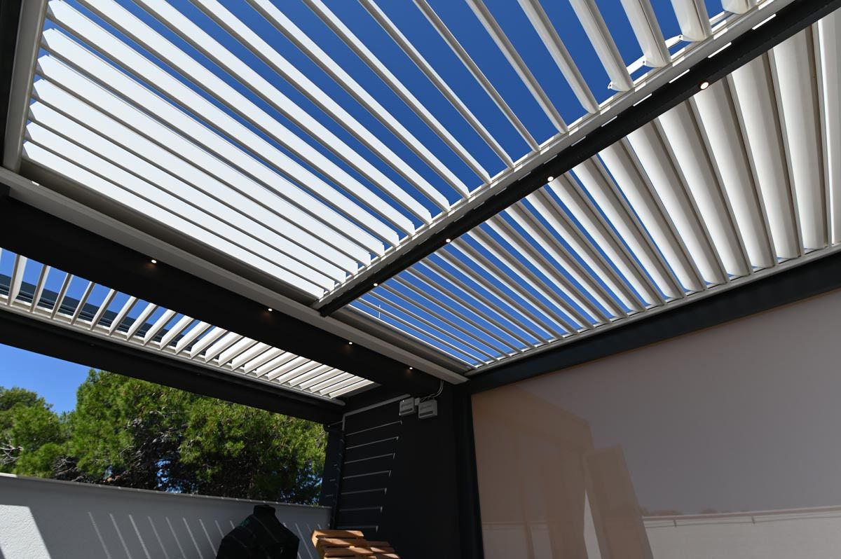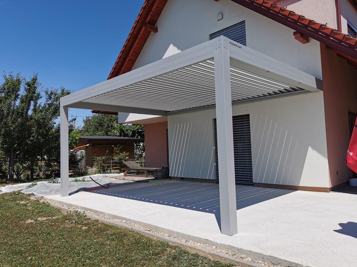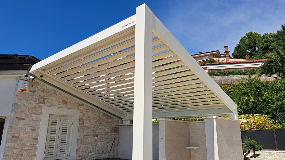 Elegantna pergola je v celoti v beli (RAL 9010) barvi in se vizualno popolnoma ujema z arhitekturo svetle mediteranske hiše. Sestavljena je iz enega polja vzporednih lamel, ki omogočajo rotacijo in s tem nadzor nad svetlobo, zračenjem ter zaščito pred dežjem.