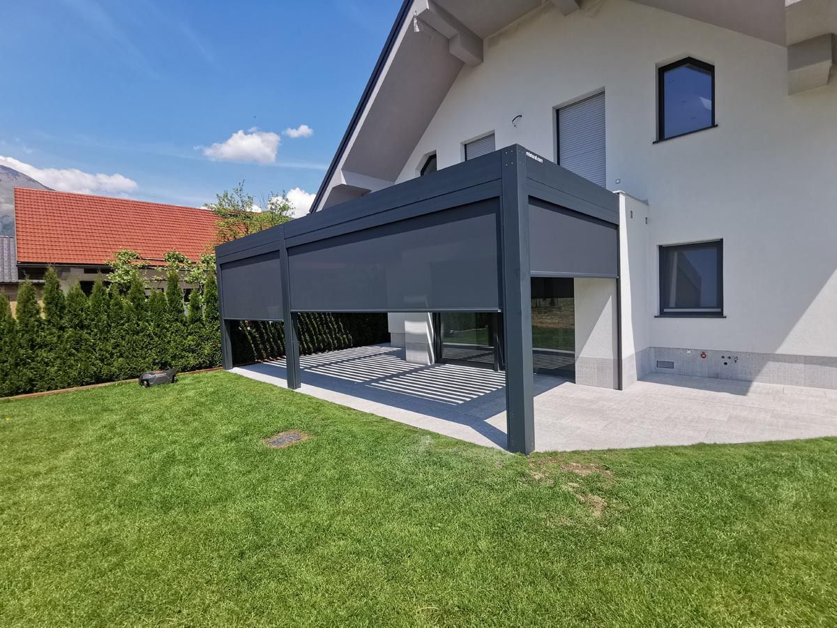 Ta pergola je več kot le estetski element – je sodobna rešitev, ki spremeni teraso v funkcionalen bivalni prostor za uživanje v vseh vremenskih razmerah in letnih časih.