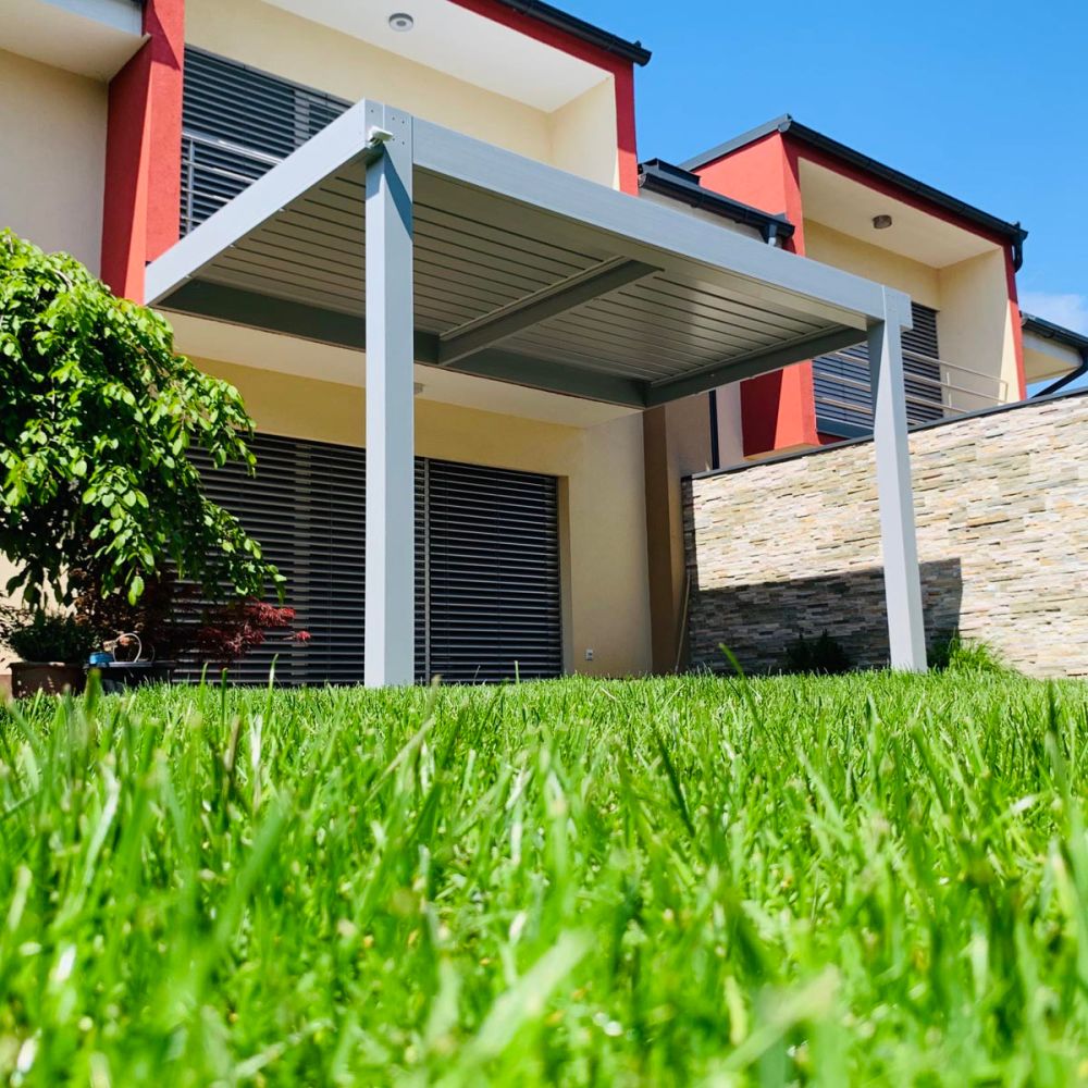Ob hiši je postavljena elegantna bioklimatska pergola v prefinjenem sivo-srebrnem odtenku RAL 9006, pri kateri sta tako konstrukcija kot lamele barvno usklajene v sodobnem minimalističnem videzu.
