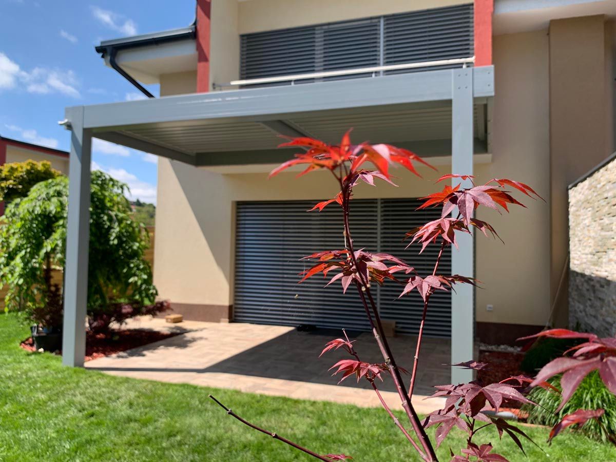 Bioklimatska pergola na terasi dvojčka v elegantni sivo-srebrni barvi (RAL 9006), ki s svojim prečiščenim videzom ustvarja moderen, harmoničen vtis.