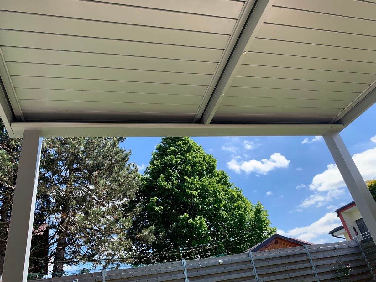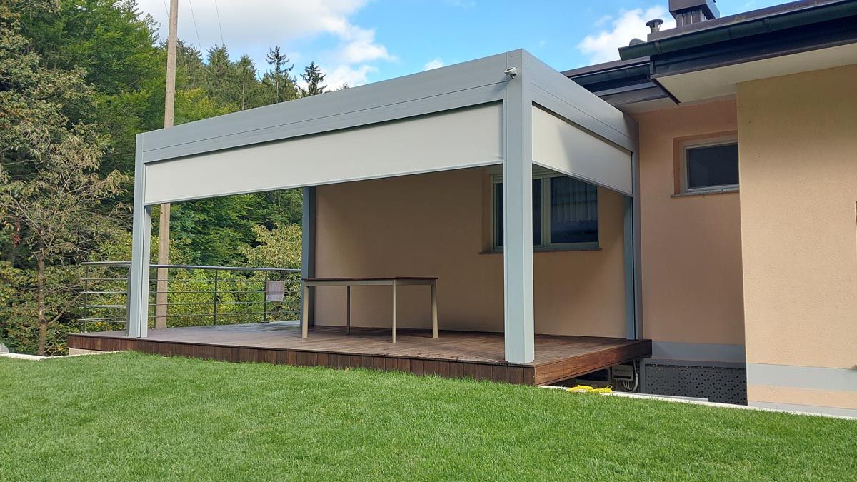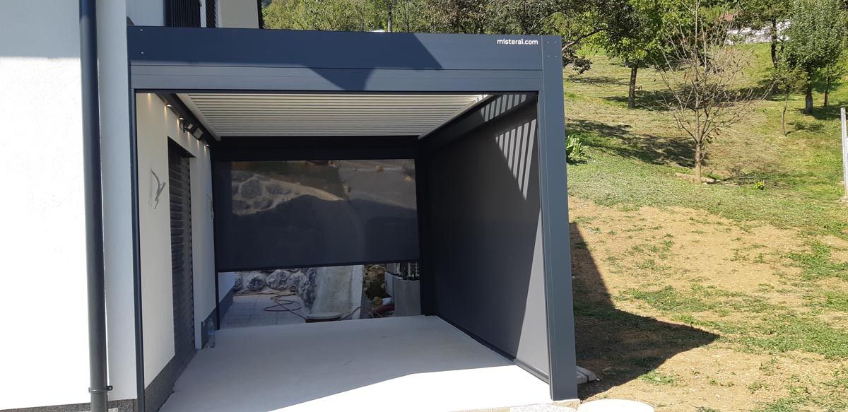 Pergola je pripeta na objekt z vodotesnim stikom, dodatno stabilnost pa ji zagotavljata dva aluminijasta stebra.