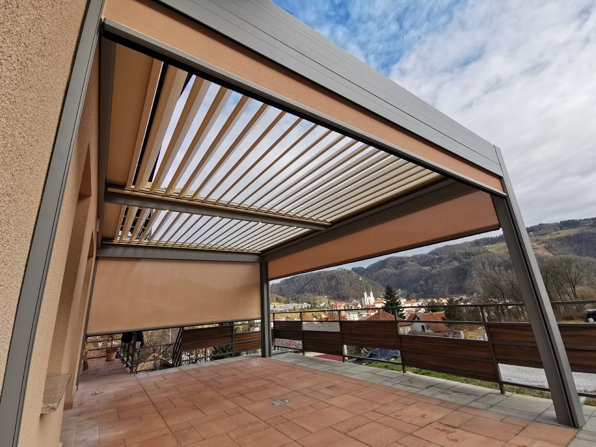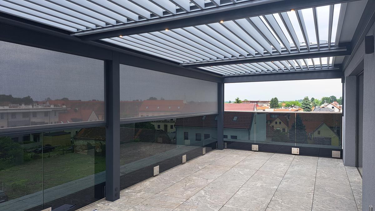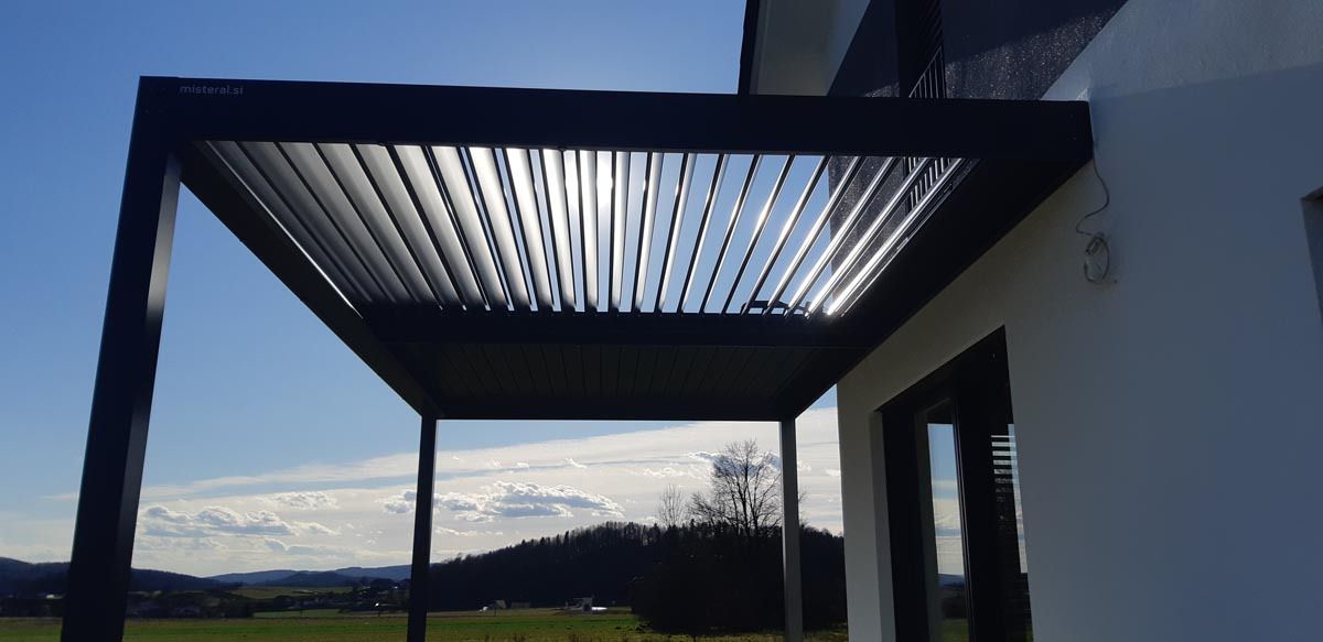 Sestavljena je iz dveh polj vzporednih lamel, ki se lahko obračajo do 160°, kar omogoča natančno regulacijo sončne svetlobe, prijetno prezračevanje in popolno zaščito pred dežjem. Tako terasa postane funkcionalna v vseh vremenskih razmerah – od senčne oaze v vročih dneh do udobnega zavetja ob večernem dežju.