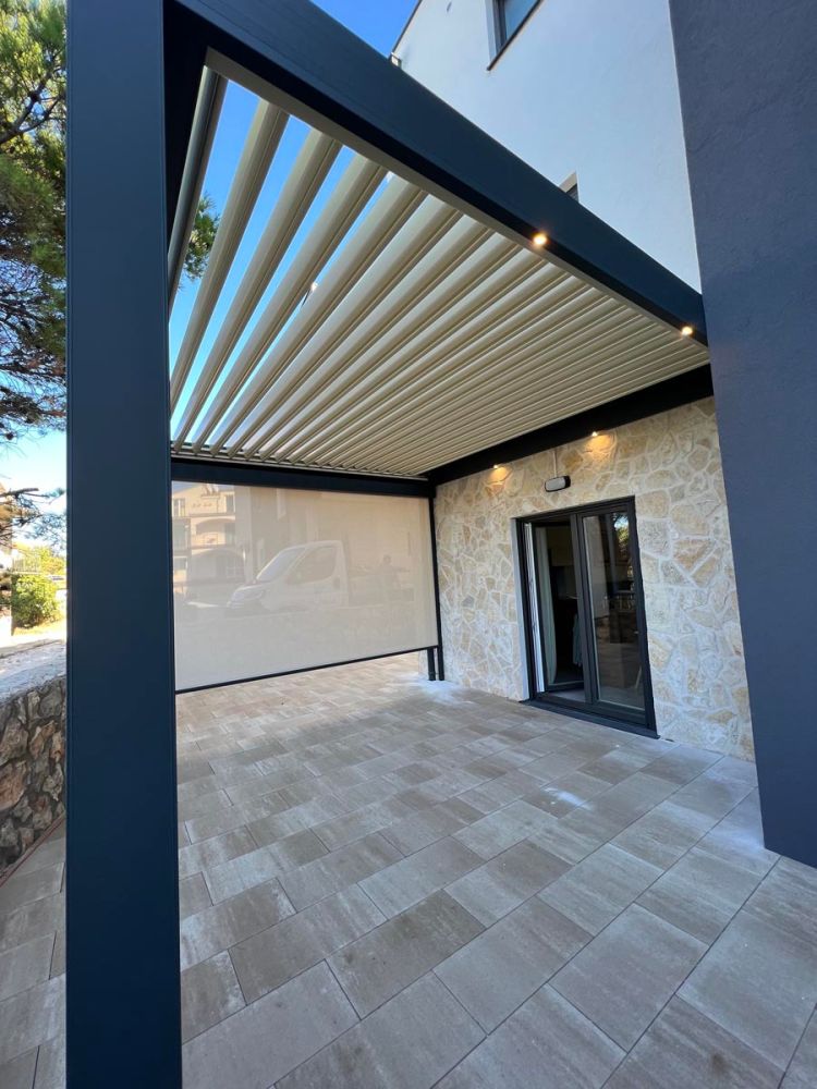 Na terasi apartmaja v Dalmaciji je postavljena bioklimatska pergola, ki združuje antracitno konstrukcijo (RAL 7016) in bele lamele (RAL 9010), kar ustvarja eleganten kontrast in se odlično poda k arhitekturi hiše.