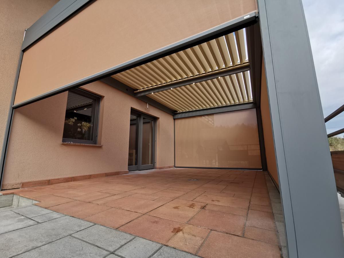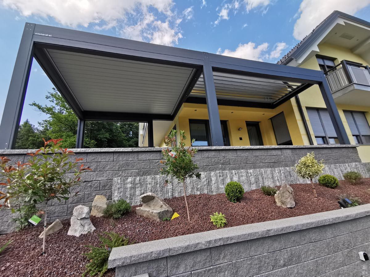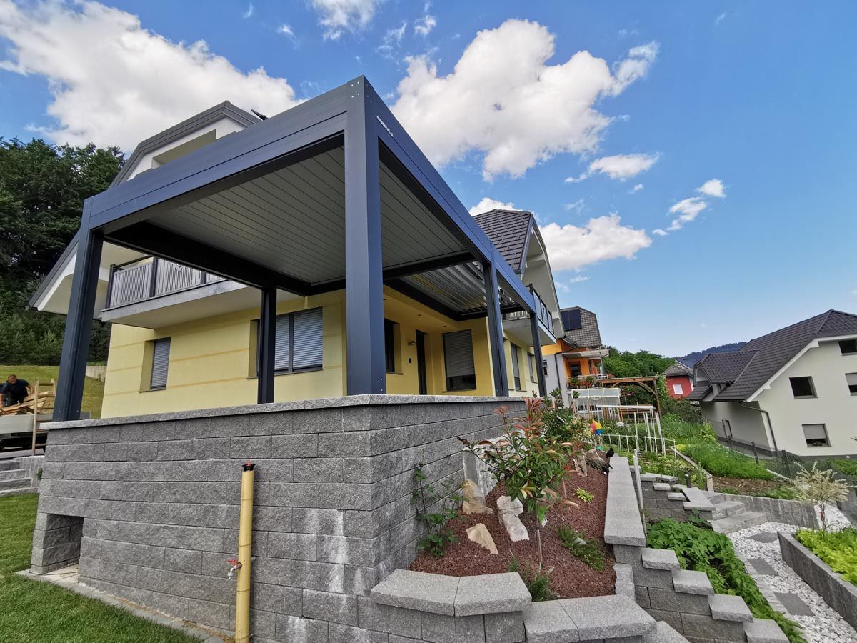 Na terasi je umeščena bioklimatska pergola, zasnovana iz enega manjšega in enega večjega polja, kar ustvarja zanimivo razgibanost in dinamičen videz. Konstrukcija v elegantni antracitni barvi (RAL 7016) s sivimi lamelami, ki poskrbijo za kontrast.