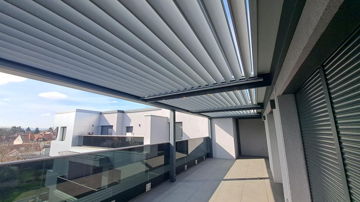 Na balkonski terasi je postavljena večja bioklimatska pergola, zasnovana v elegantni kombinaciji antracitne konstrukcije (RAL 7016) in belih lamel (RAL 9010), ki prostoru doda sodoben in prefinjen videz.