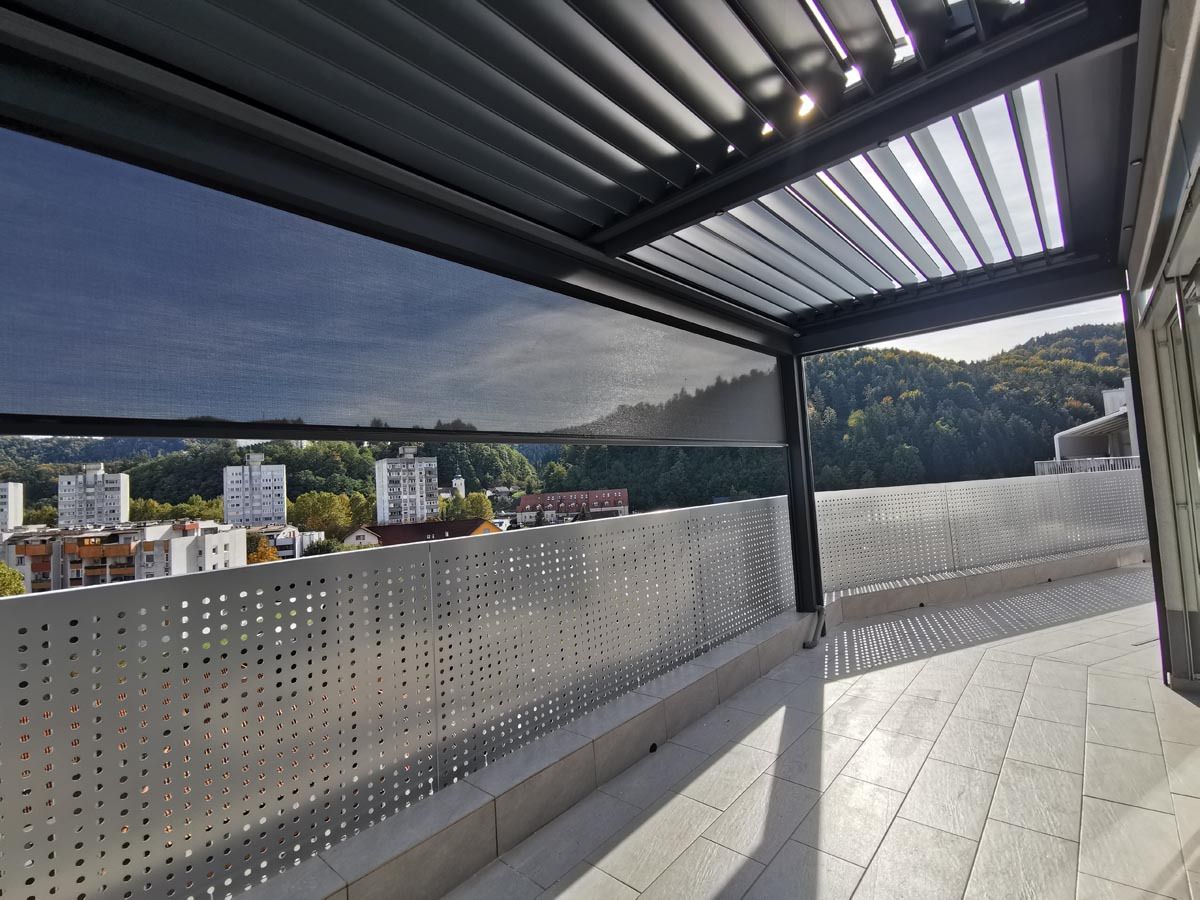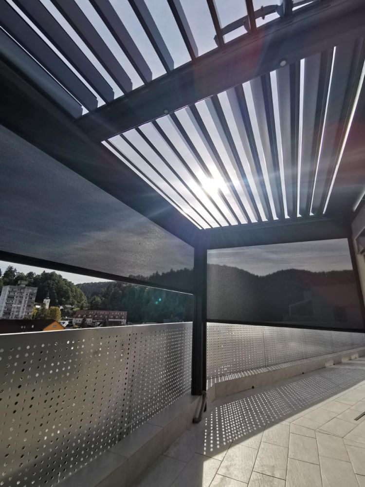 Teraso v Velenju krasi elegantna bioklimatska pergola v sodobnem antracitnem odtenku (RAL7016), ki se popolno ujema z arhitekturo objekta.