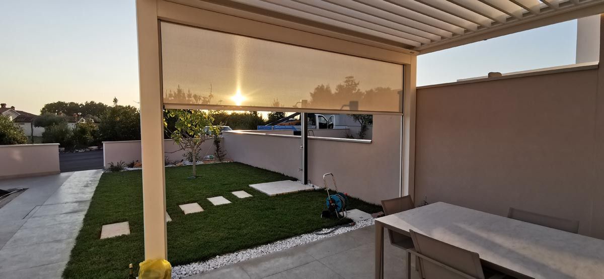 Na pergoli so integrirane LED luči, ki prostor spremenijo v prijetno osvetljeno zatočišče ob večerih. Po štirih stranicah so dodani ZIP screen roloji, ki nudijo učinkovito zaščito pred soncem, vetrom in radovednimi pogledi, hkrati pa ohranjajo občutek zasebnosti in udobja.