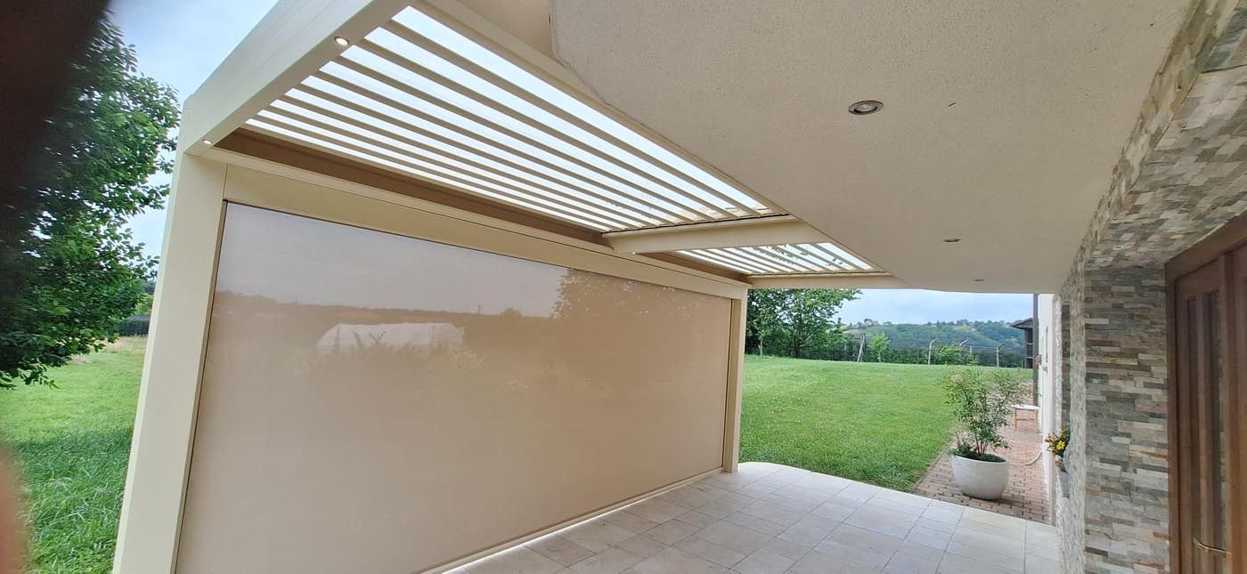 Sestavljena je iz enega bioklimatskega polja s pravokotnimi lamelami, ki omogočajo rotacijo do 160° za prilagodljivo senčenje in prezračevanje, ter enega fiksnega dela, izdelanega iz kakovostnih aluminijastih panelov, ki nudijo stalno zaščito pred vremenskimi vplivi.
