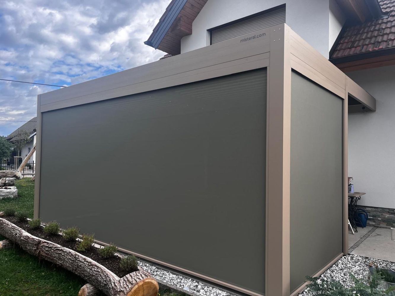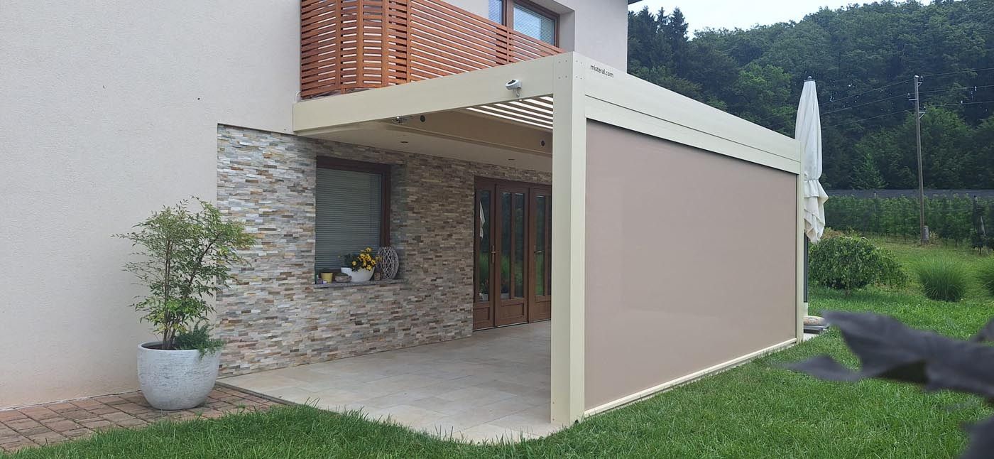 Pergola je prislonjena na objekt, njeno stabilnost pa zagotavlja pet stebrov, od katerih je en vmesni namenjen pritrditev zip screen rolojev. Skupaj so na pergoli nameščeni štirje zip screen roloji, ki nudijo popolno zaščito pred vremenskimi vplivi in hkrati omogočajo zasebnost.