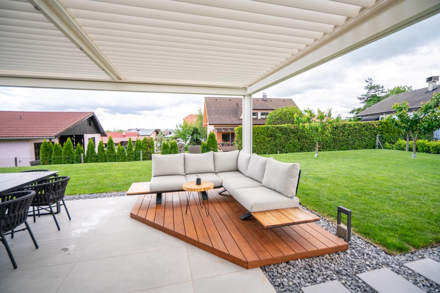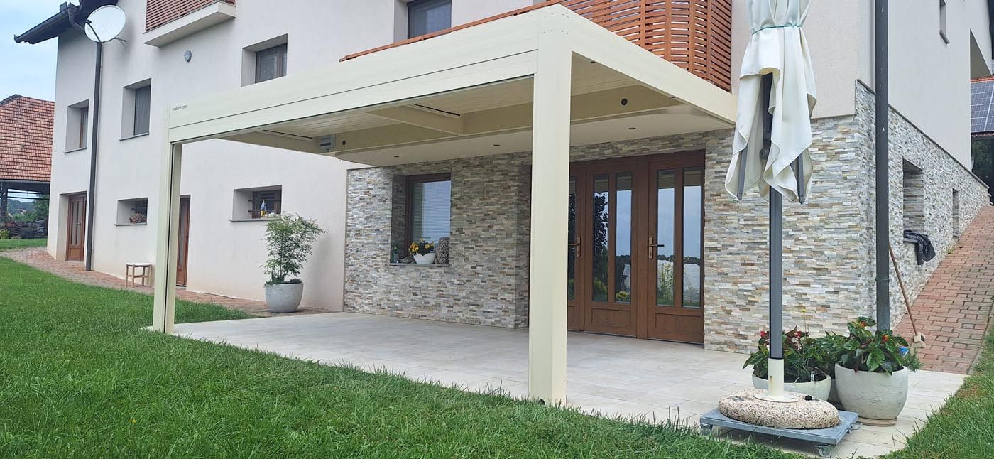 Na terasi stoji bioklimatska pergola v svetlem odtenku RAL 1015, ki s svojo umirjeno barvo deluje toplo in prijetno ter se lepo ujema z arhitekturo objekta.