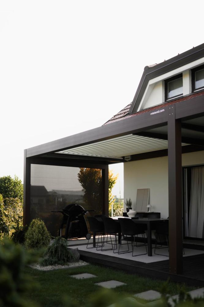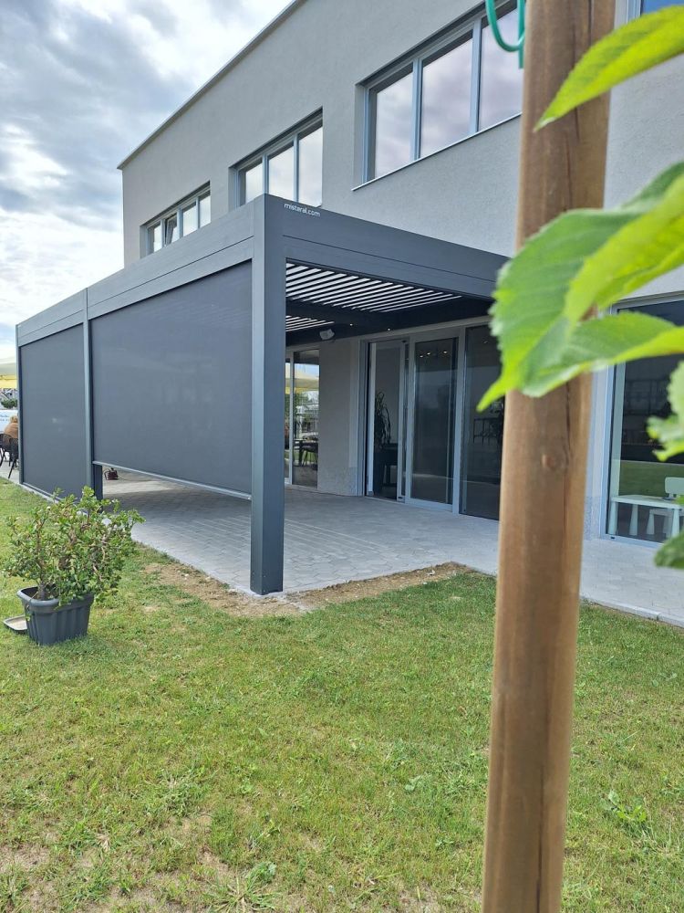 Ta pergola naredi teraso vizualno privlačno in hkrati uporabno v vseh vremenskih pogojih, saj nudi zavetje, senco in intimnost – popolna rešitev za uživanje na prostem skozi vse leto.