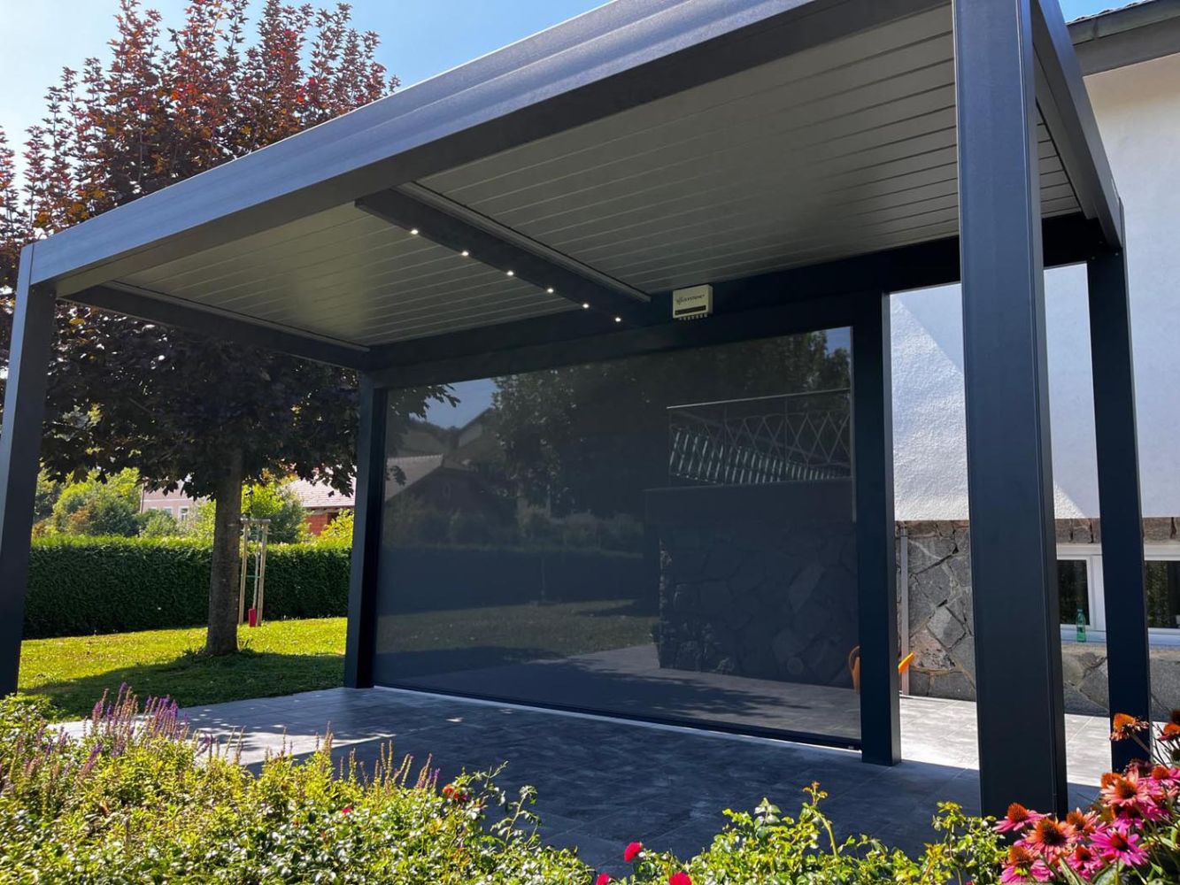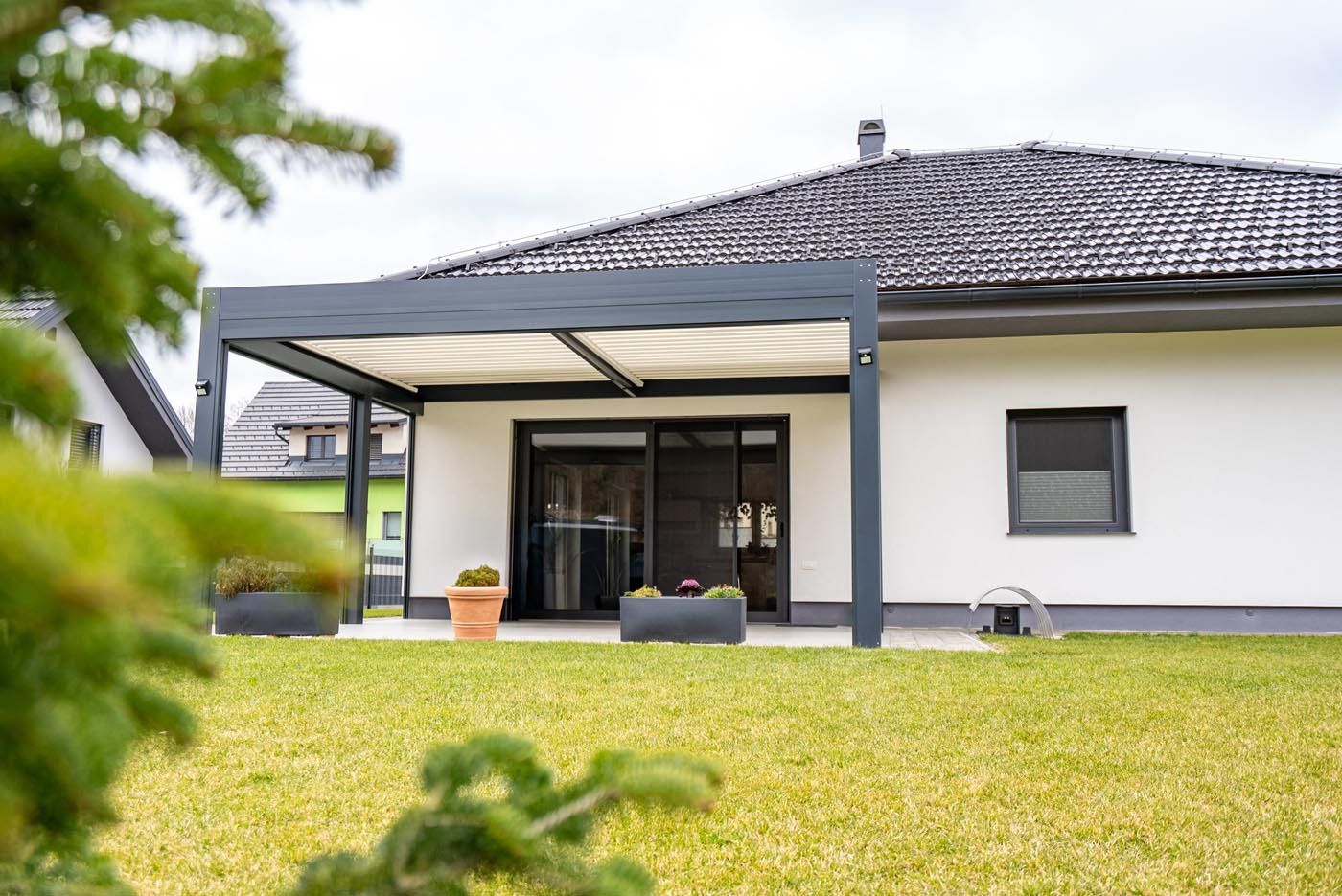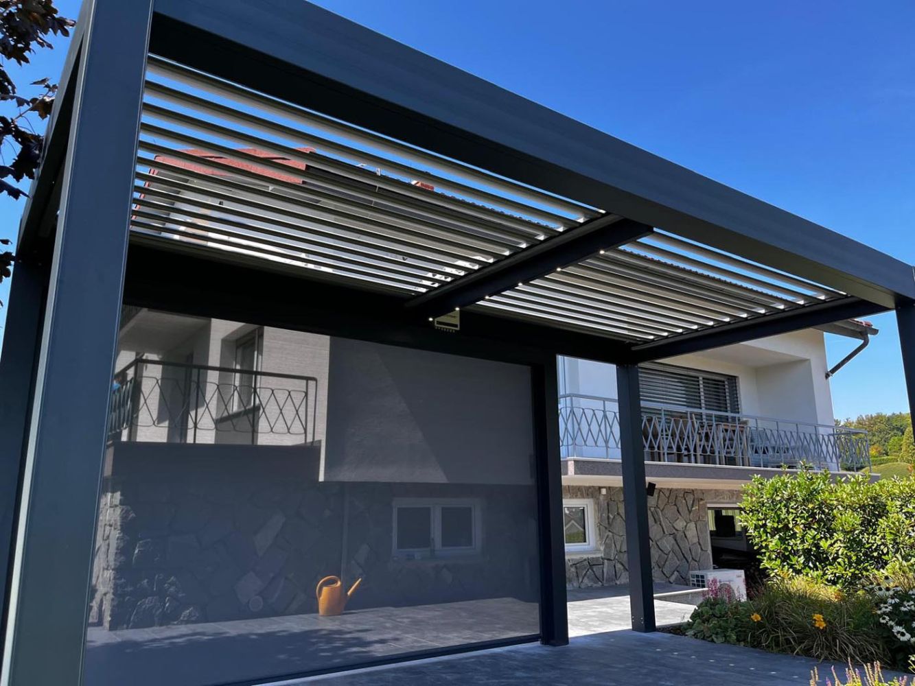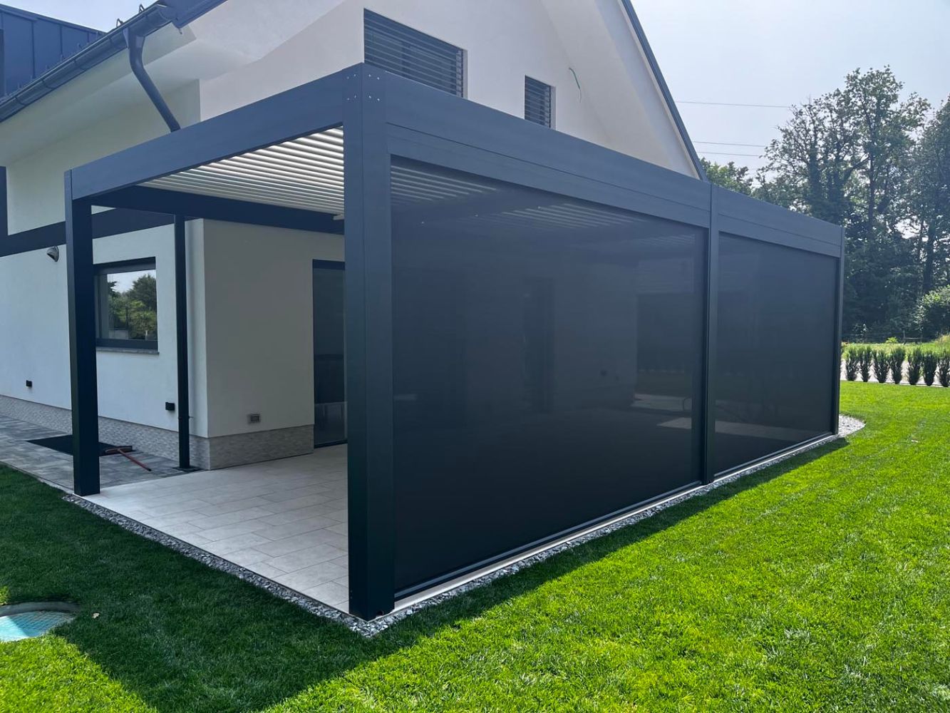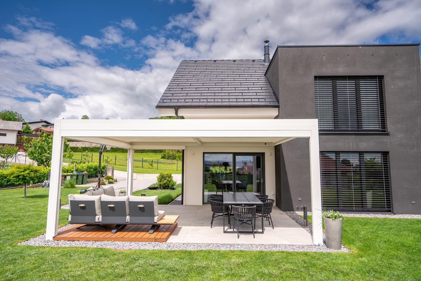 Ob hiši na vrtu stoji samostoječa bioklimatska pergola v sodobni antracitni barvi (RAL 7016), ki s svojim minimalističnim videzom elegantno dopolnjuje zunanji prostor.