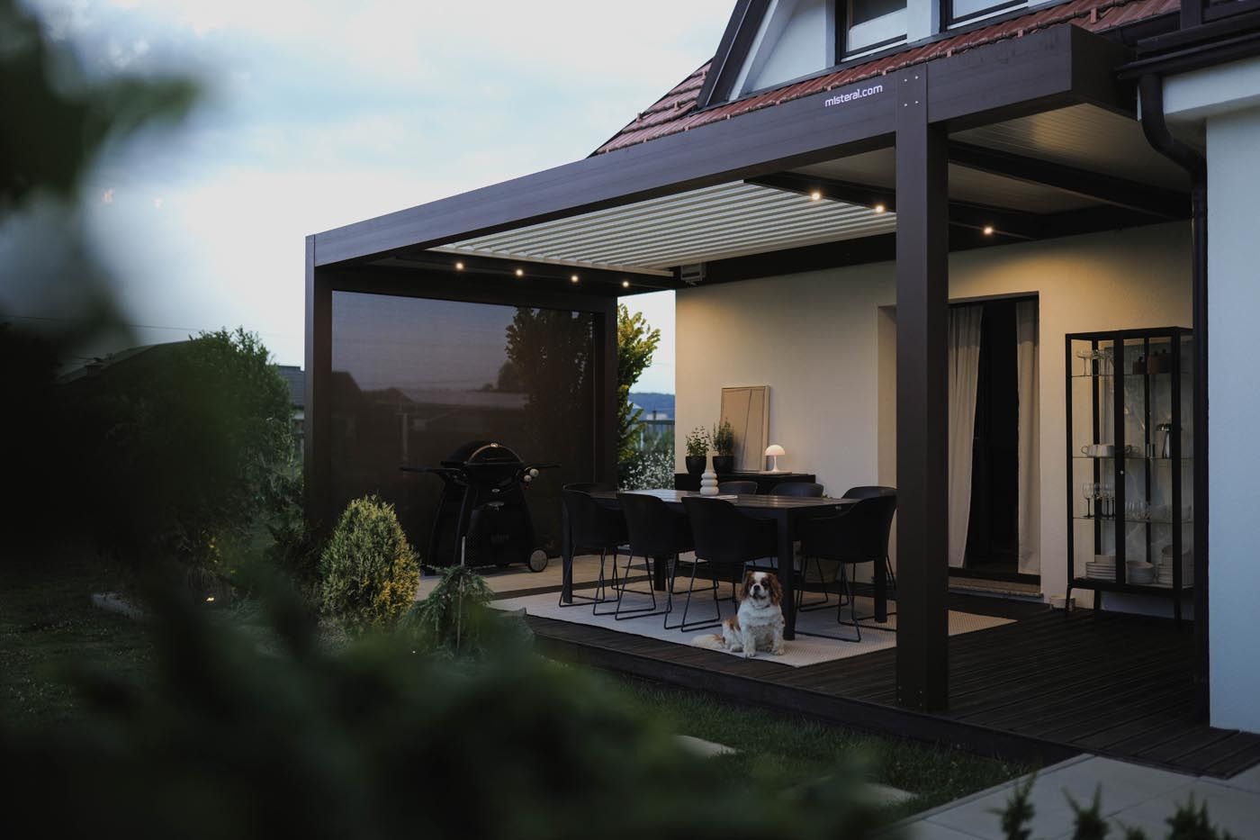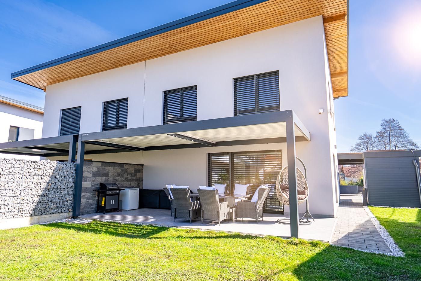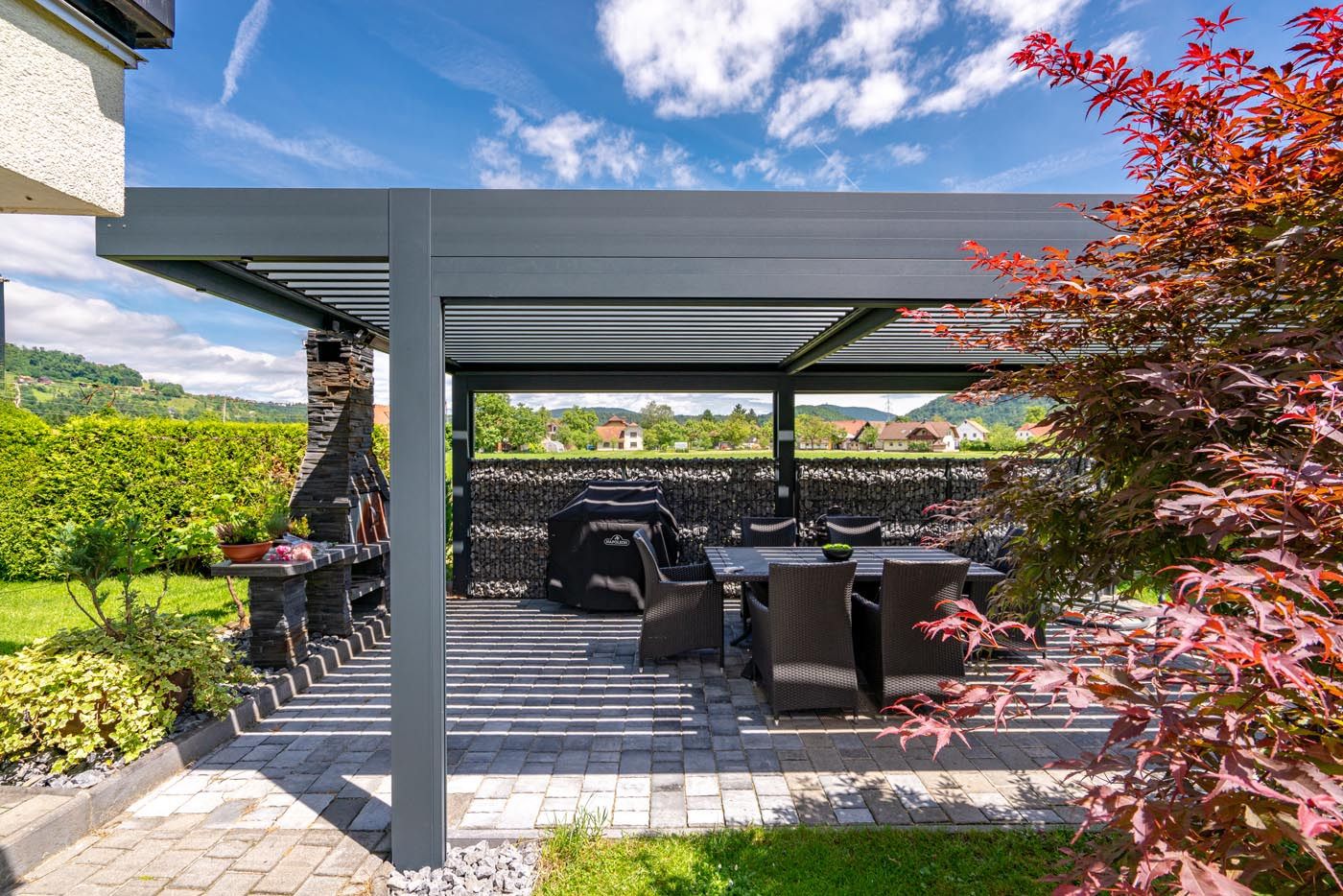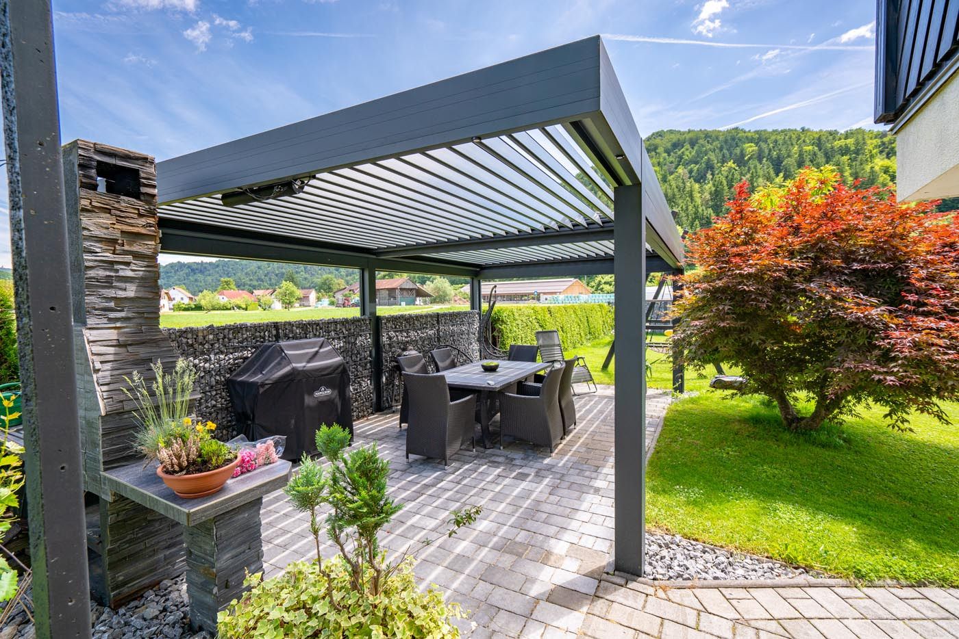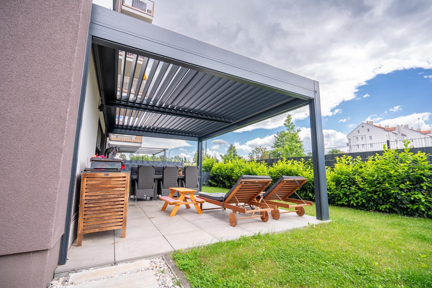 Ob hiši na vrtu stoji samostoječa bioklimatska pergola v sodobni antracitni barvi (RAL 7016), ki s svojim minimalističnim videzom elegantno dopolnjuje zunanji prostor.