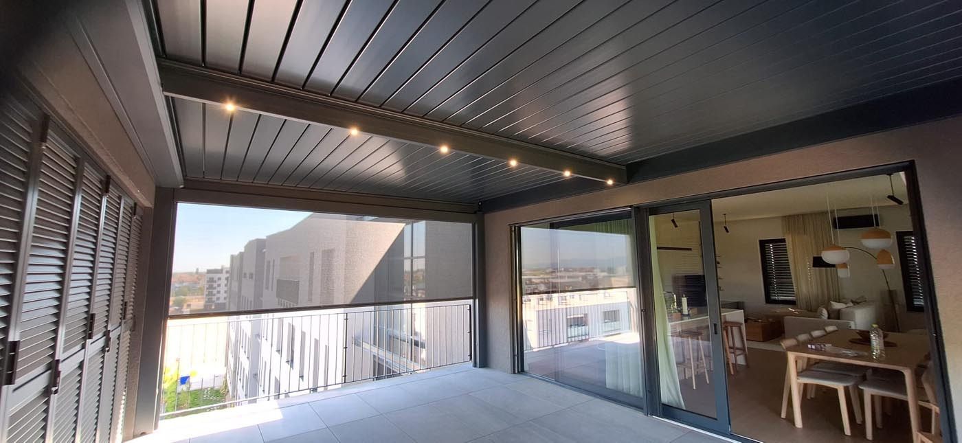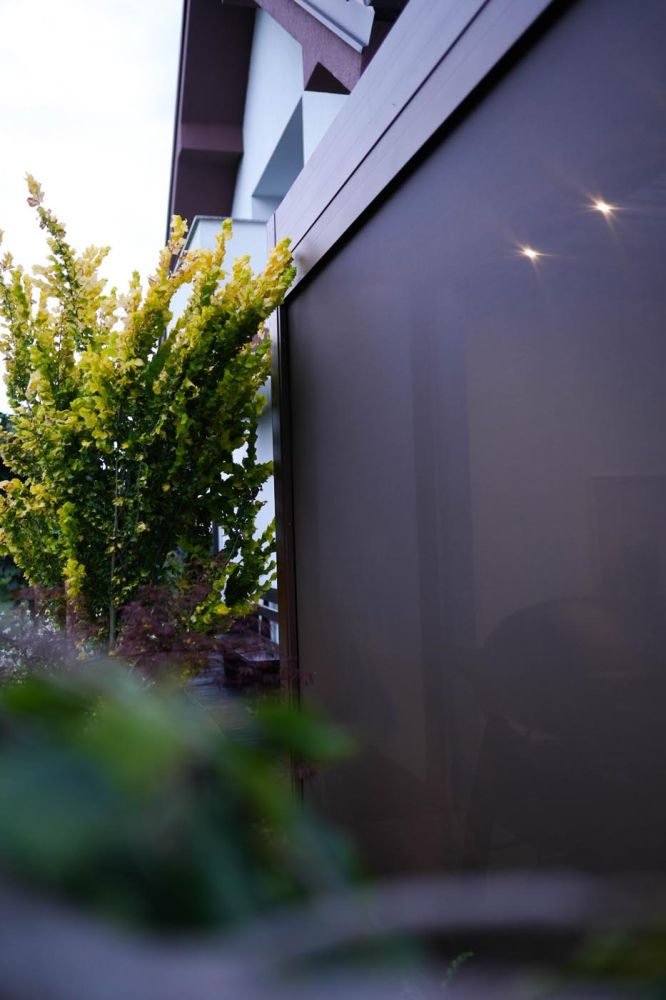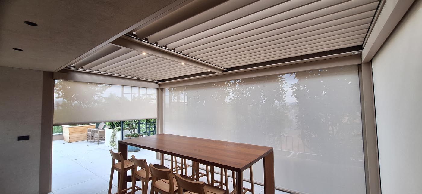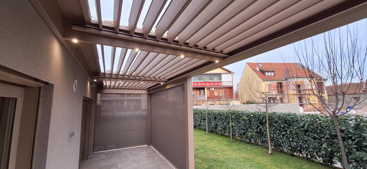 Na treh odprtih stranicah so vgrajeni zip screen roloji, prav tako v barvi konstrukcije, ki nudijo popolno zaščito pred soncem in vetrom. Za prijetno uporabo v večernih urah so v pergolo integrirane LED luči, ki ustvarijo mehko, ambientalno osvetlitev.