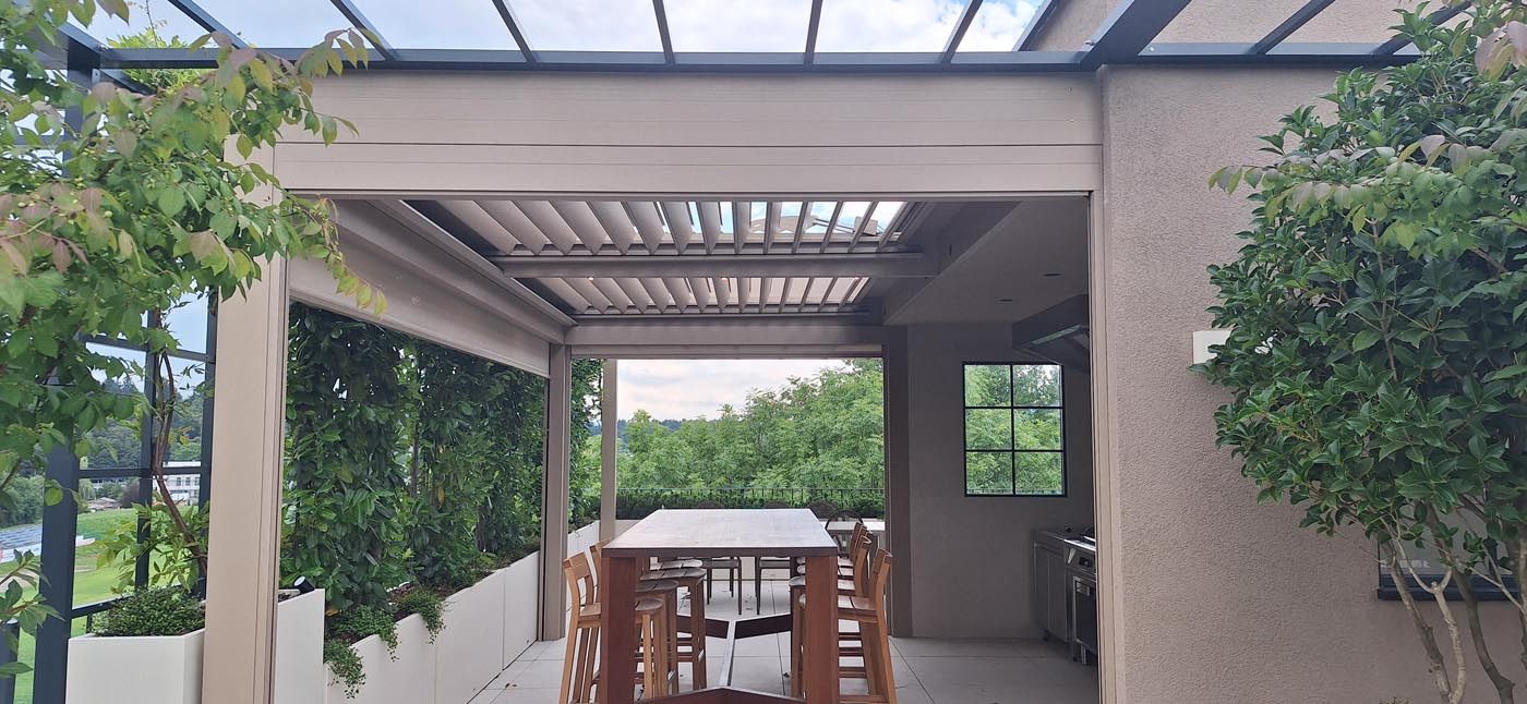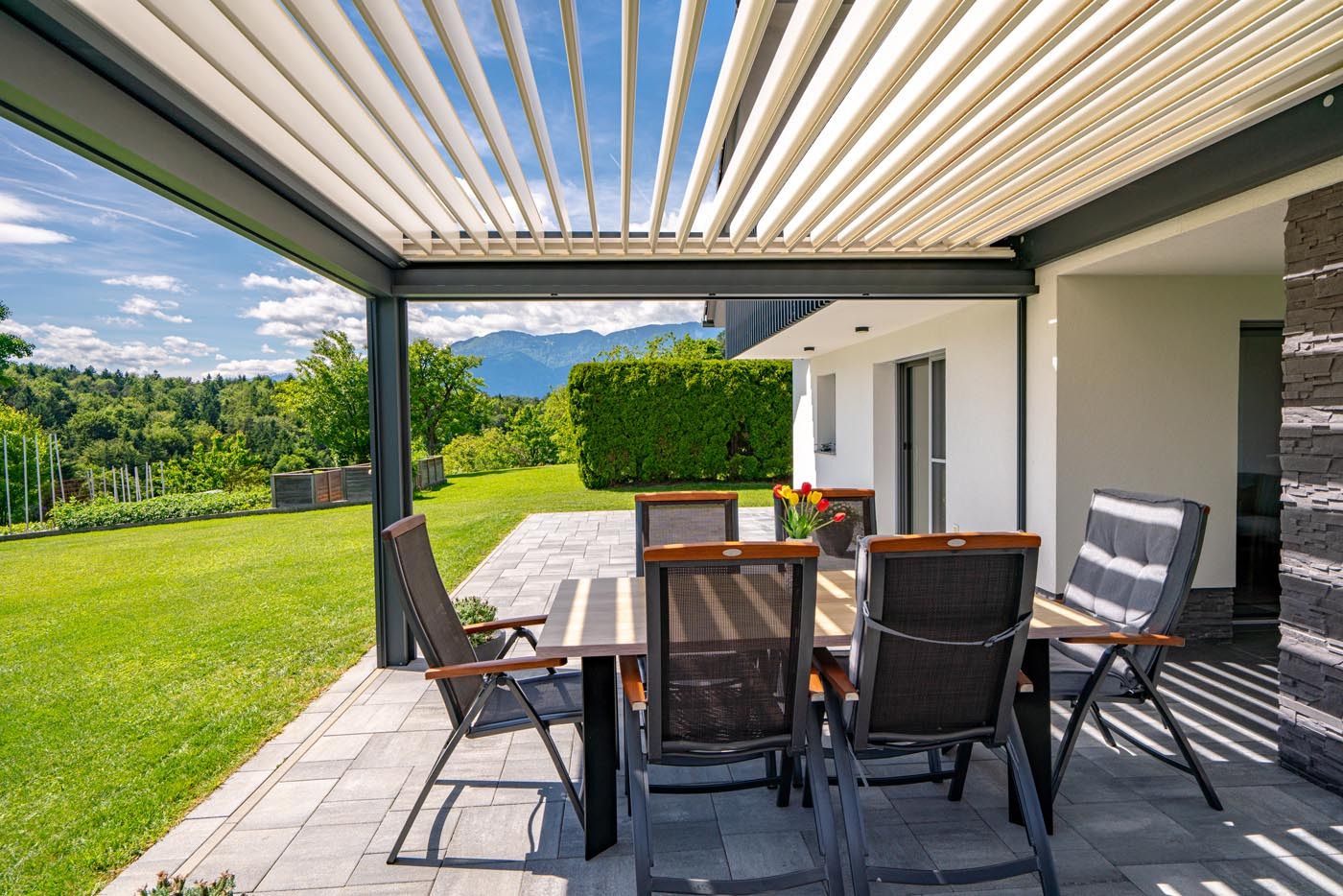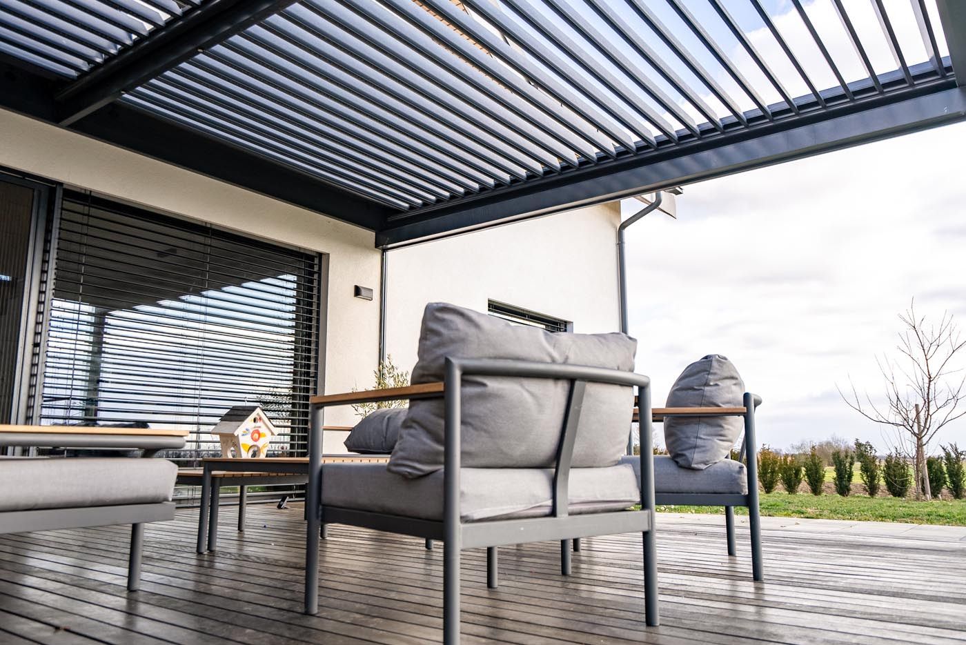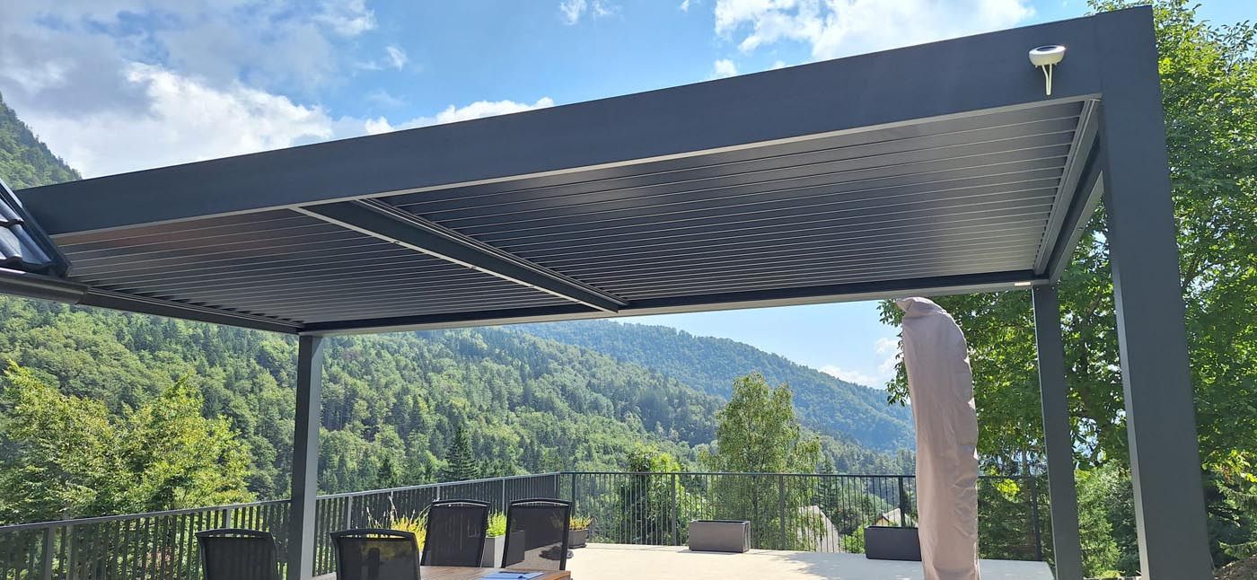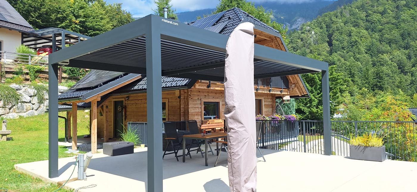 Na čudoviti, arhitekturno zasnovani moderni terasi na Štajerskem stoji bioklimatska pergola v elegantnem sivkastem odtenku (RAL 7037), ki se odlično ujema z moderno arhitekturo objekta in ji daje poseben, prefinjen videz.