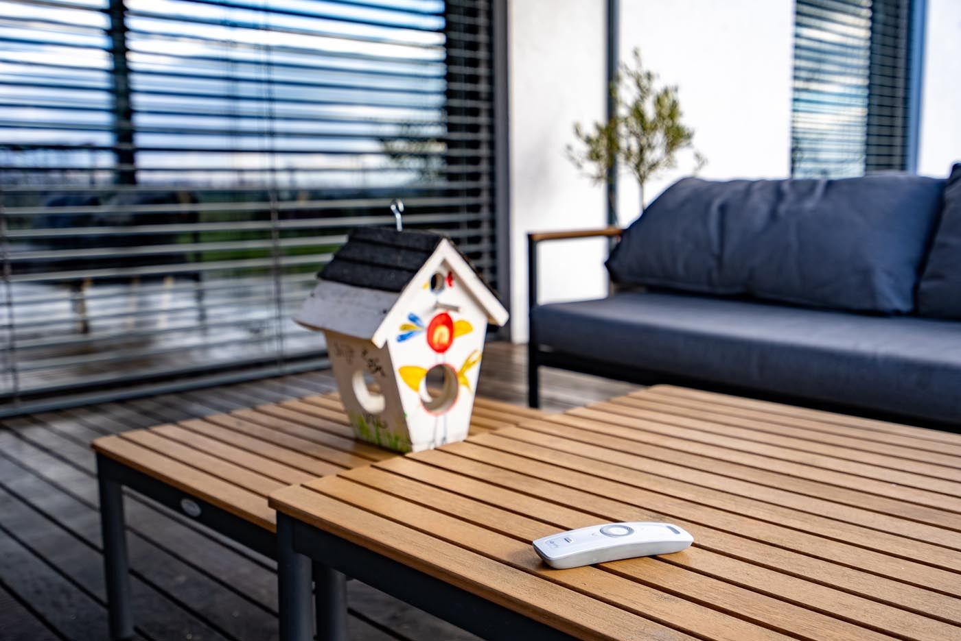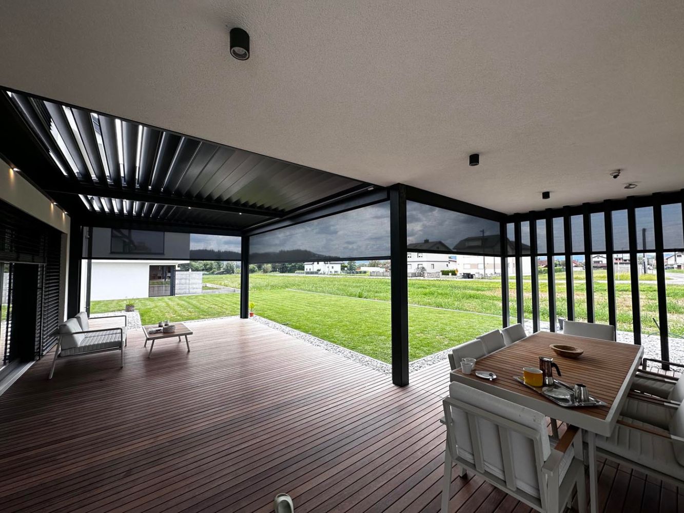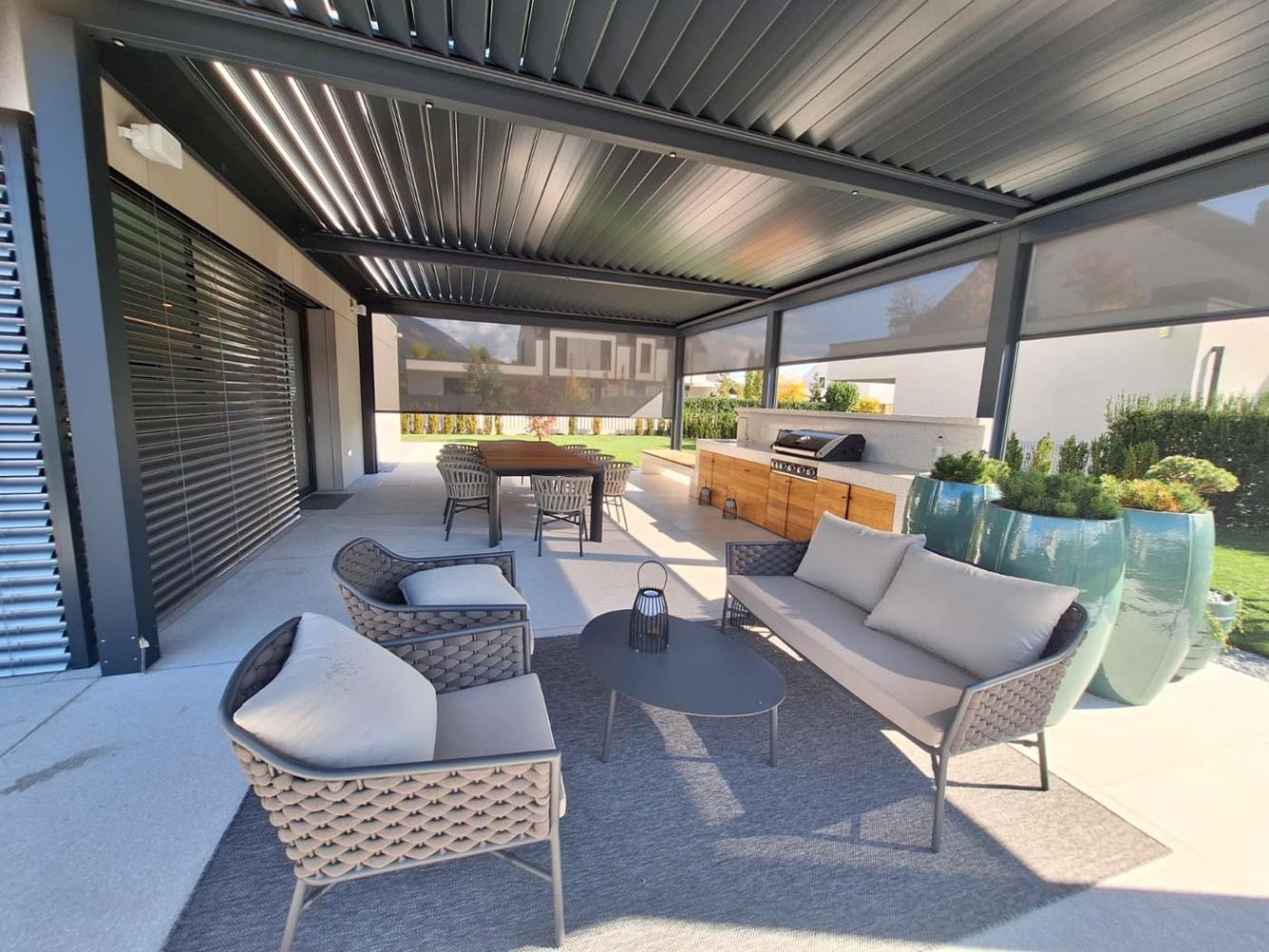 Za dodatno udobje in zaščito so na vseh straneh vgrajeni ZIP screen roloji, ki ščitijo pred vetrom, močnim soncem in pogledi ter ustvarjajo občutek intime in udobja tudi v bolj izpostavljenih trenutkih dneva. Vgrajene so tudi LED luči za prijetno ambientalno osvetlitev v večernih urah, senzorji za dež pa samodejno prilagajajo nastavitev lamel, kar omogoča brezskrbno uporabo prostora skozi celoten dan.