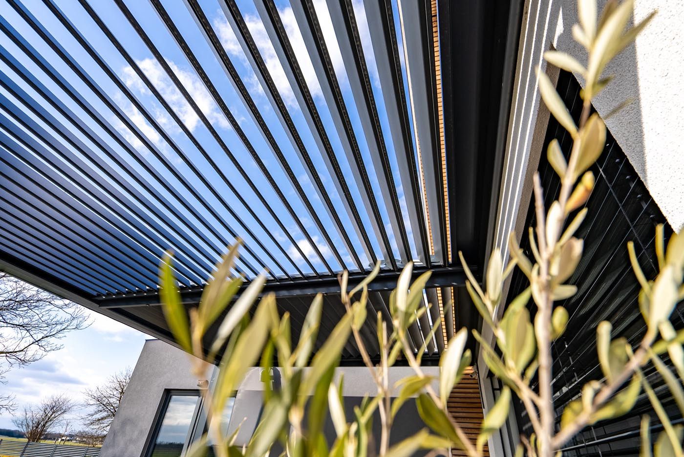 Na terasi stoji elegantna bioklimatska pergola v sodobni kombinaciji antracitne konstrukcije (RAL 7016) in belih lamel (RAL 9010), ki s svojo obliko dopolnjuje arhitekturo objekta in ustvarja prijeten zunanji bivalni prostor.