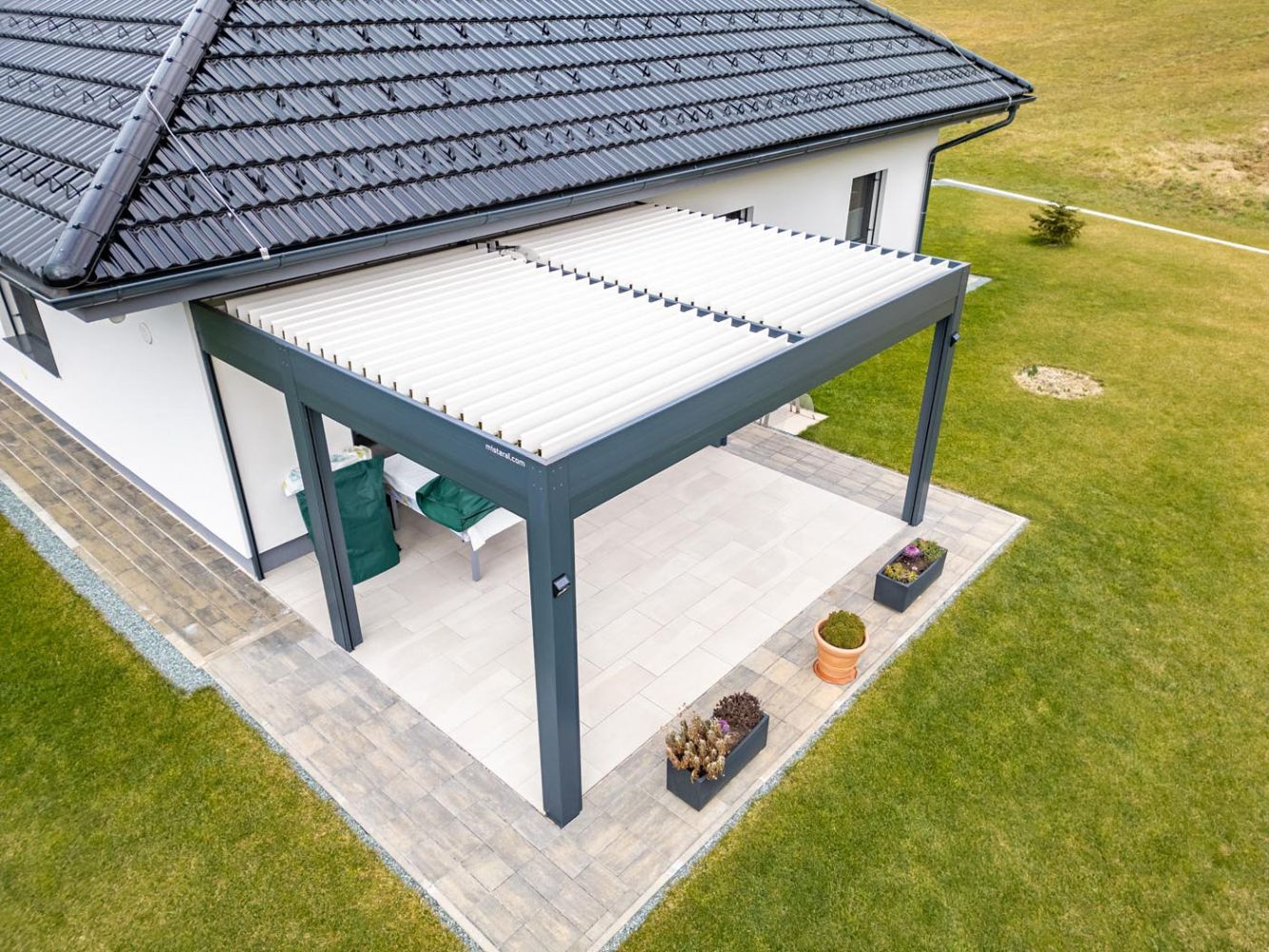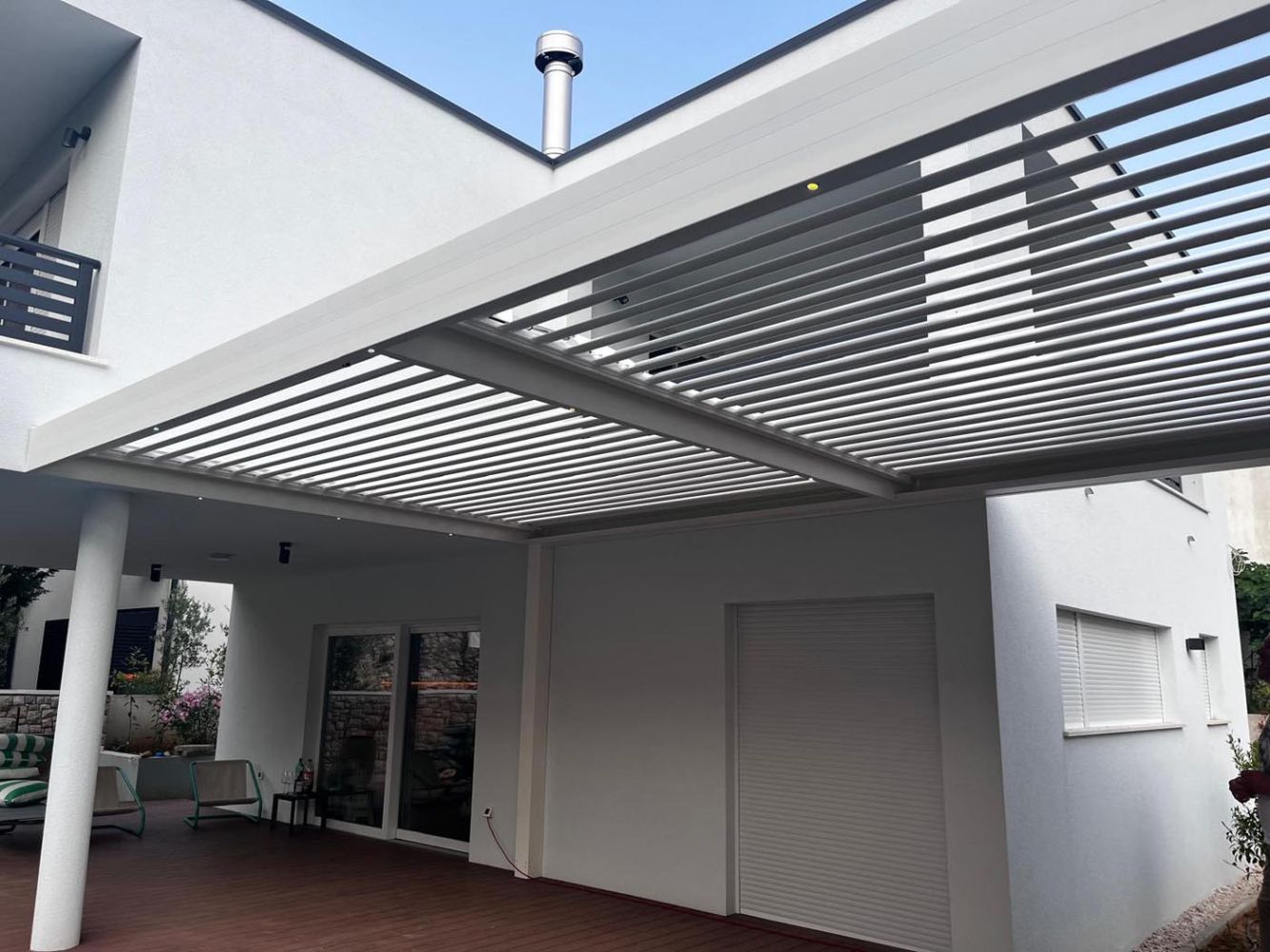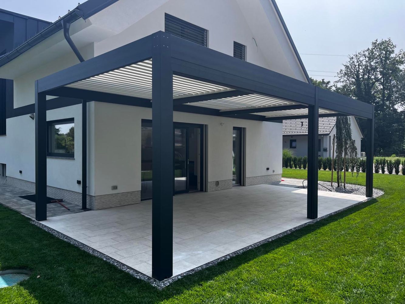 Na terasi stoji dovršena bioklimatska pergola v sodobni kombinaciji antracit konstrukcije (RAL 7016) in belih lamel (RAL 9010), ki se odlično ujema z barvno paleto hiše in dopolnjuje njen arhitekturni značaj.