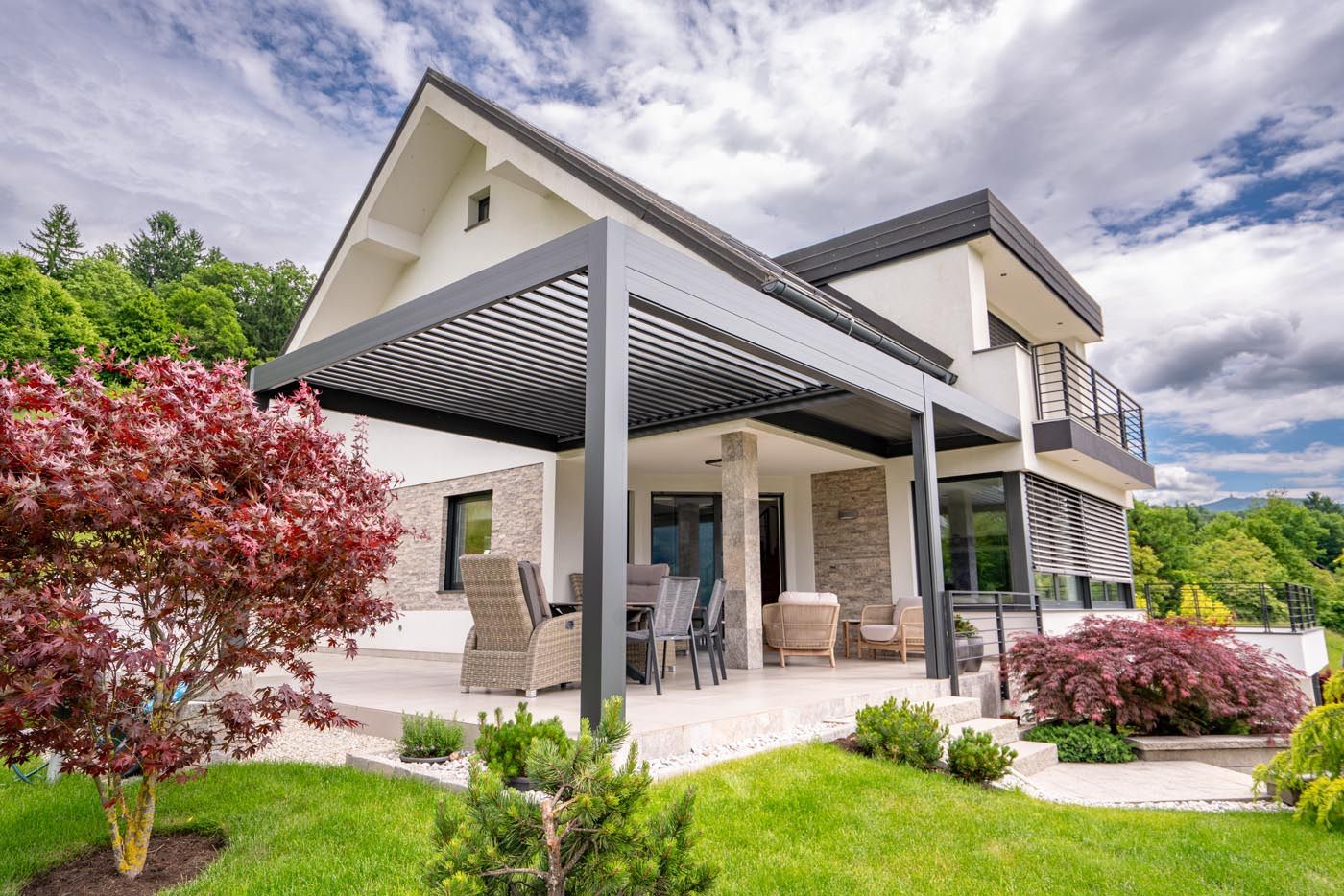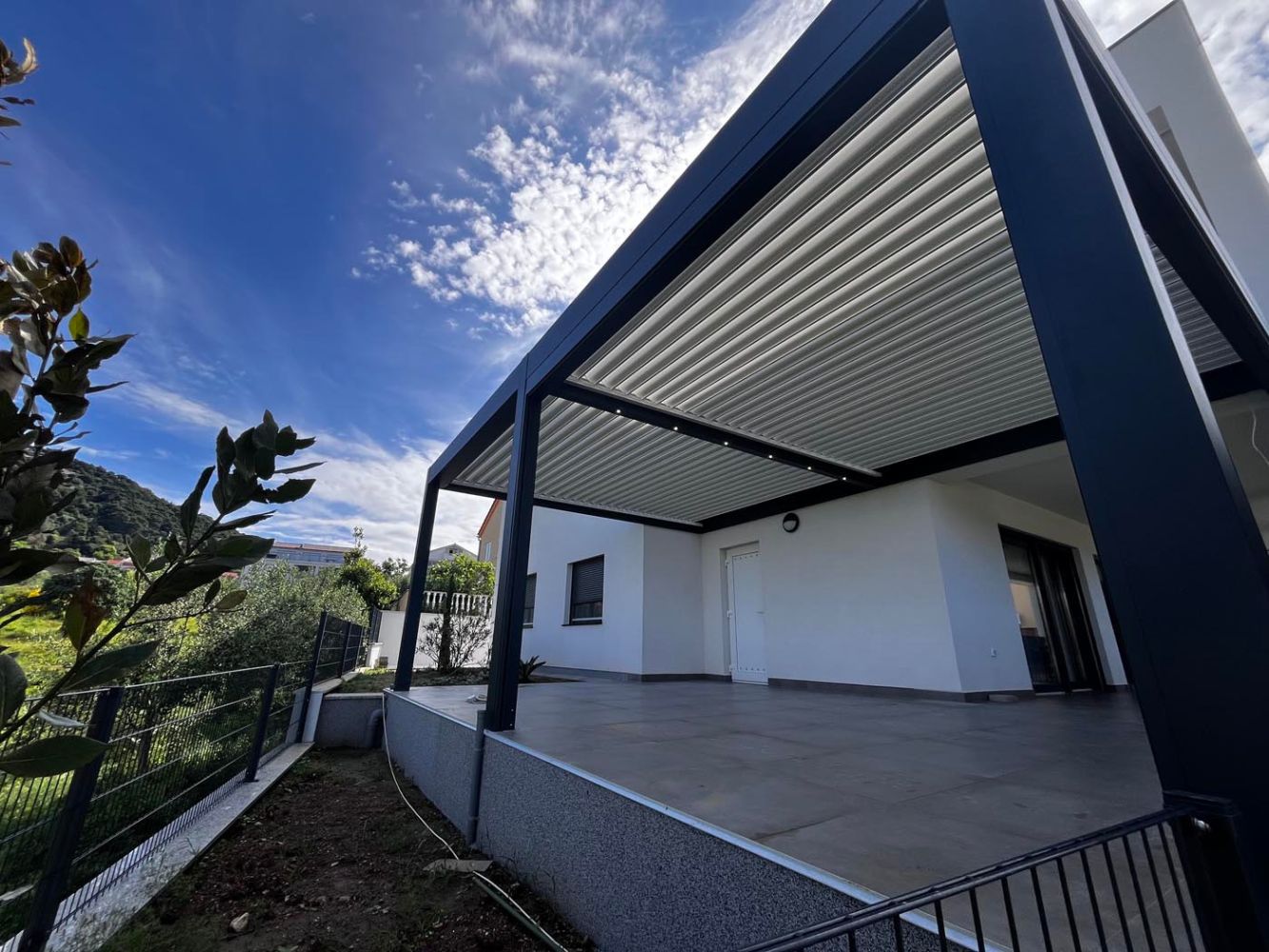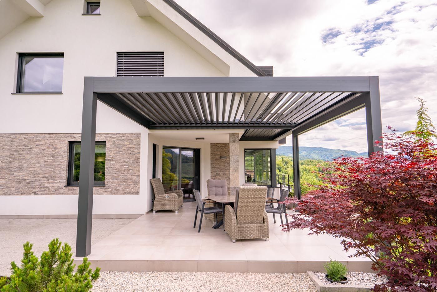 Na terasi stoji dovršena bioklimatska pergola v sodobni kombinaciji antracit konstrukcije (RAL 7016) in belih lamel (RAL 9010), ki se odlično ujema z barvno paleto hiše in dopolnjuje njen arhitekturni značaj.