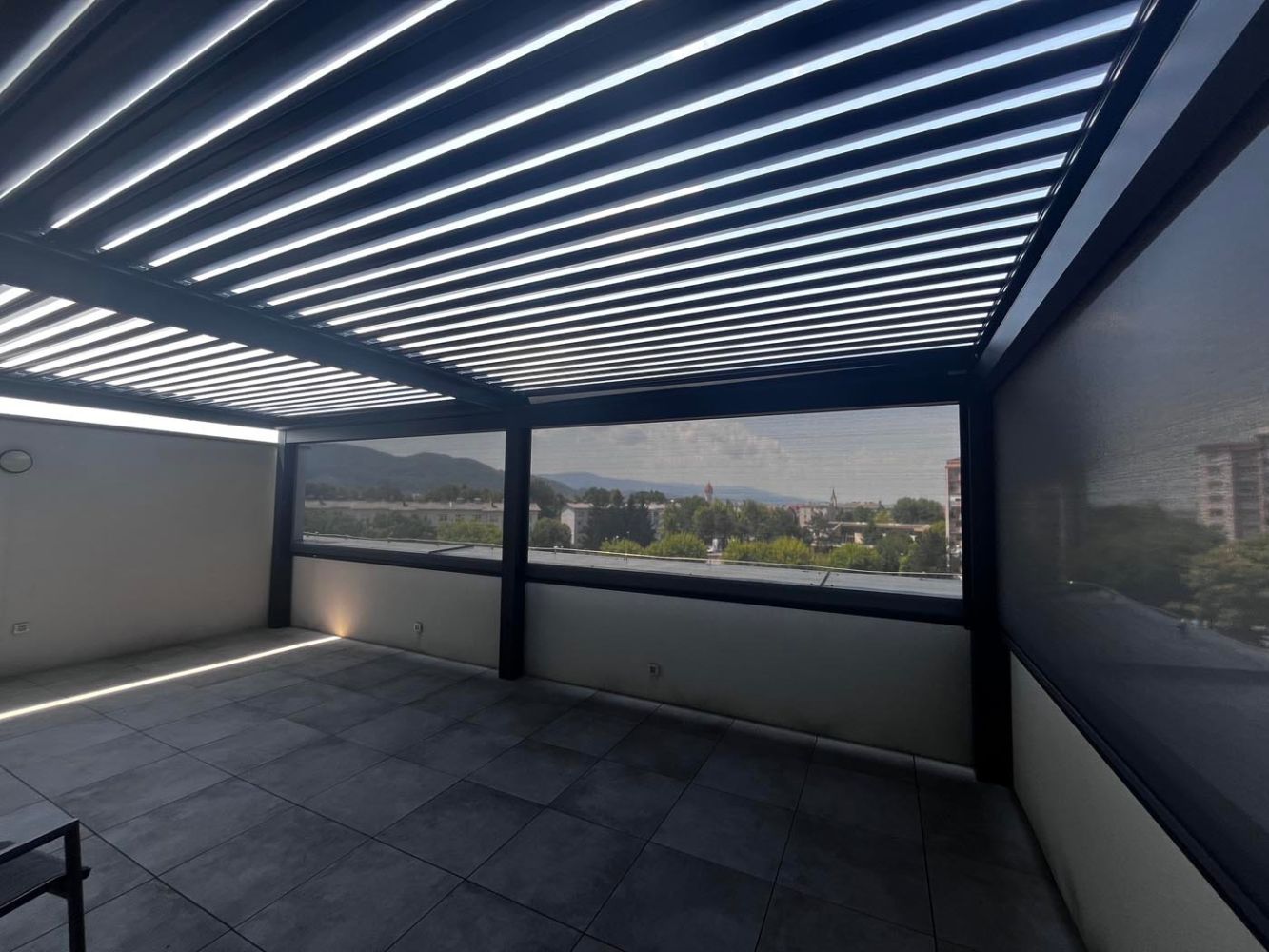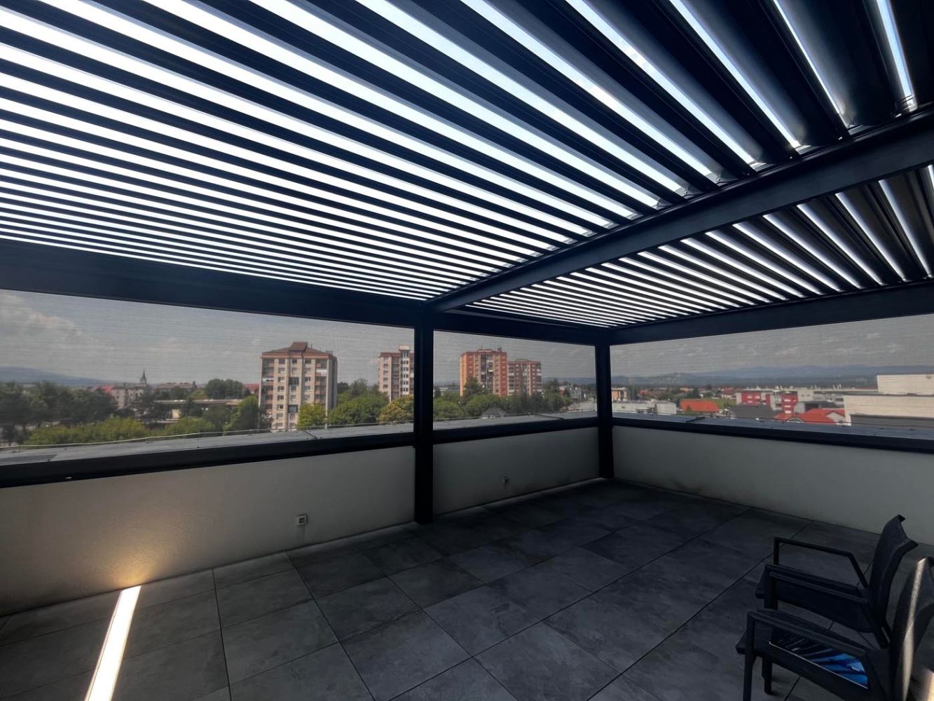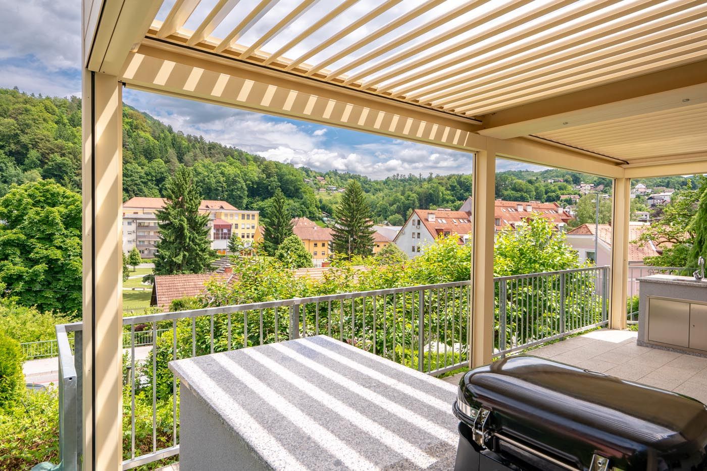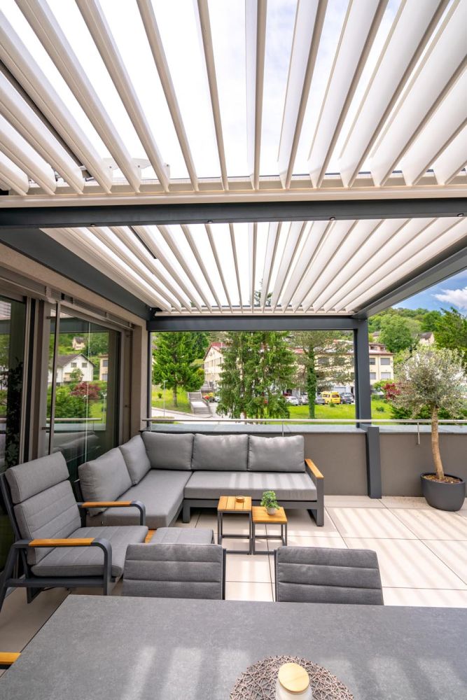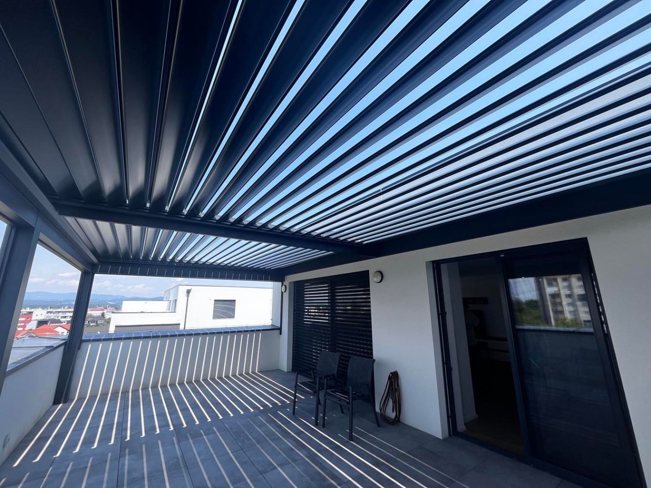 Na terasi s čudovitim razgledom na mesto stoji bioklimatska pergola v elegantni kombinaciji antracitne konstrukcije (RAL 7016) in belih lamel (RAL 9010), ki prostoru doda sodoben in prefinjen videz.