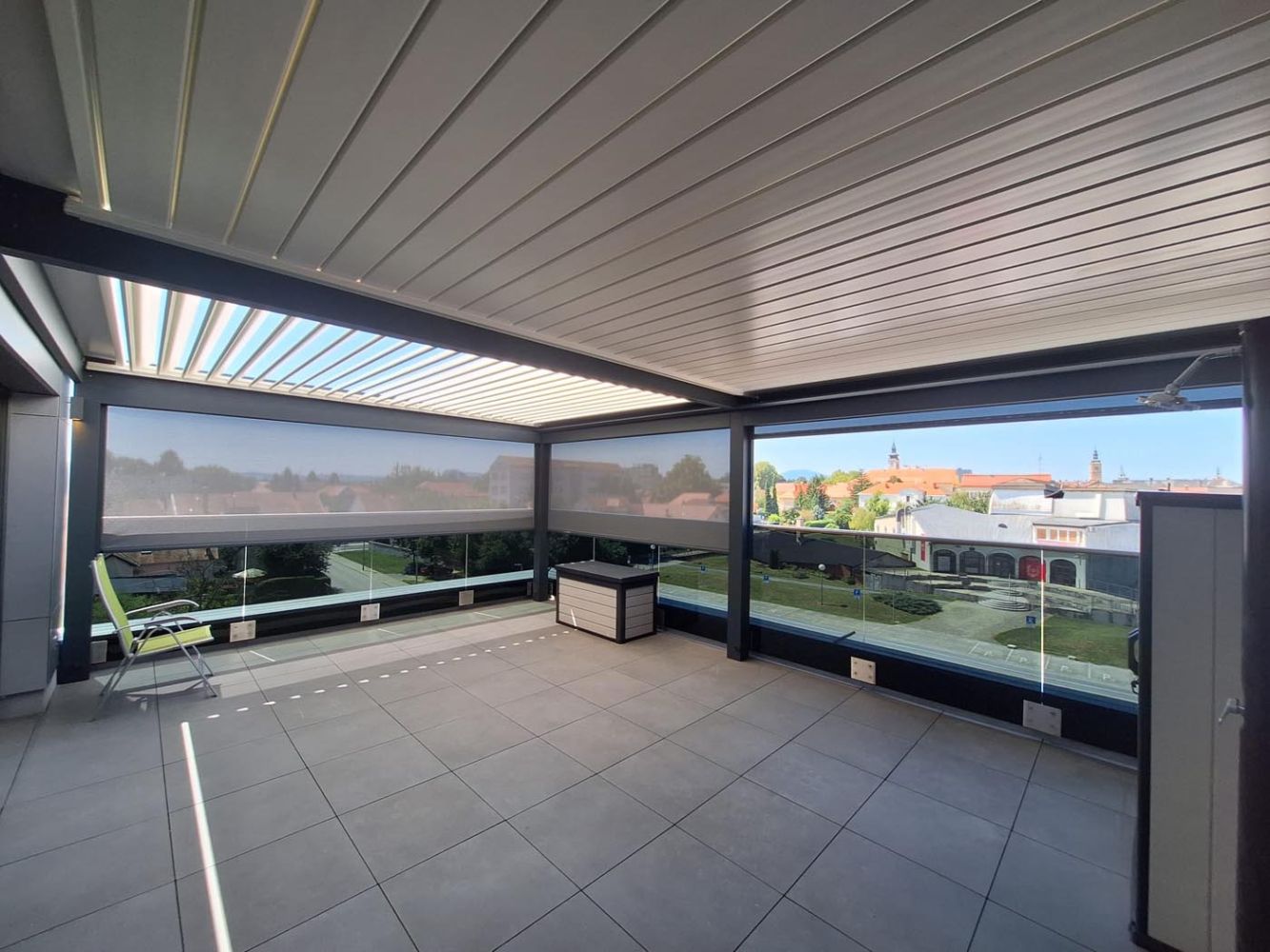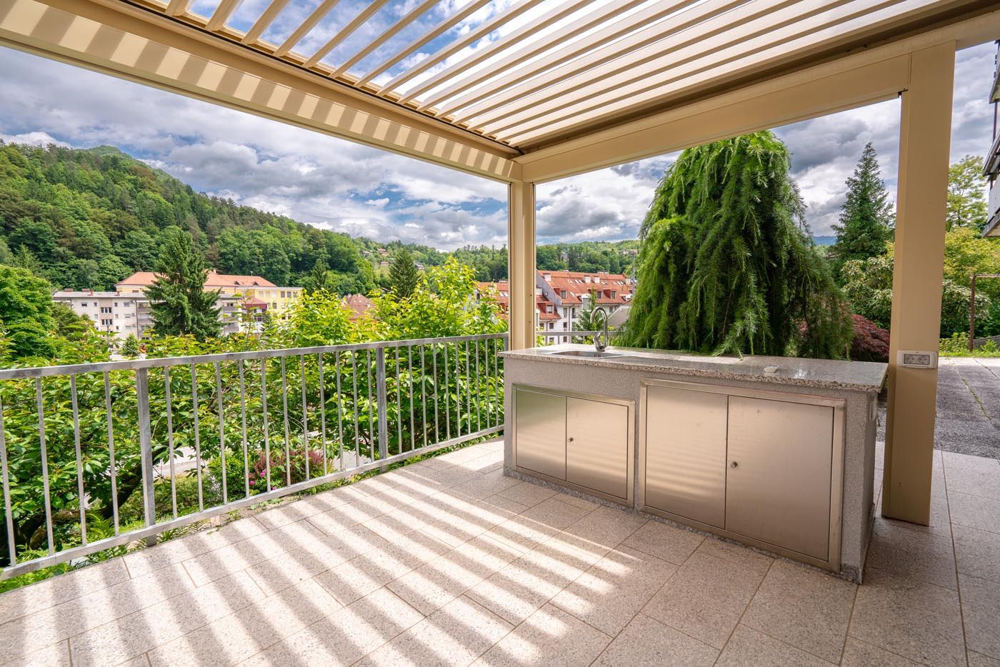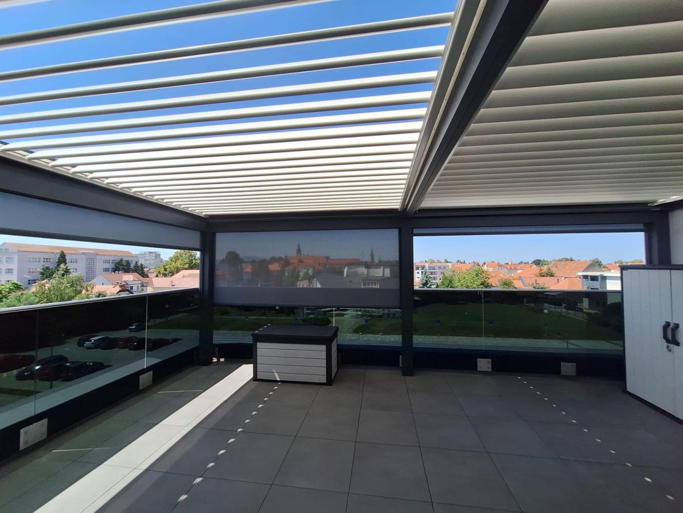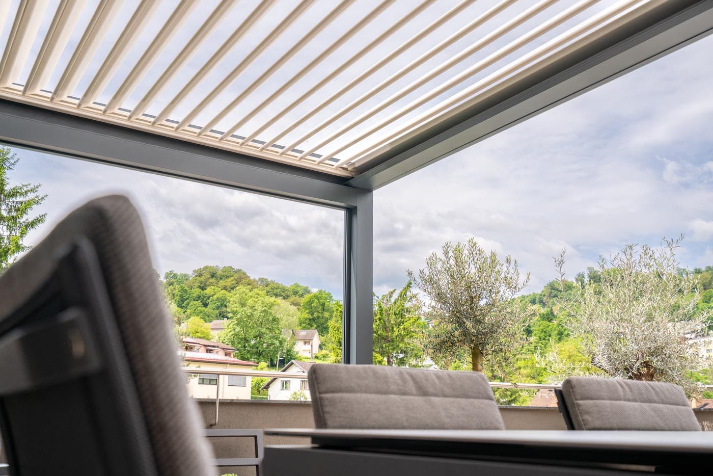 Na terasi s čudovitim razgledom na mesto stoji bioklimatska pergola v elegantni kombinaciji antracitne konstrukcije (RAL 7016) in belih lamel (RAL 9010), ki prostoru doda sodoben in prefinjen videz.