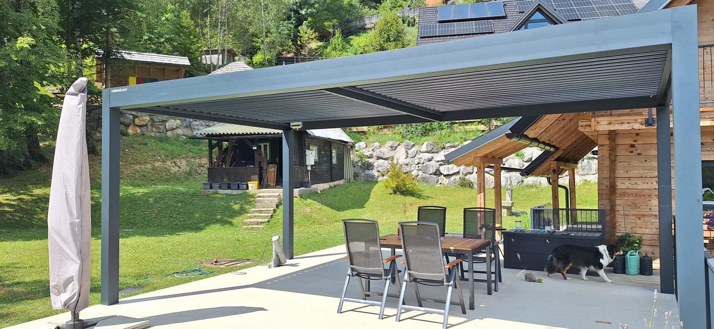 Na terasi posebne lesene hiše na Gorenjskem stoji elegantna bioklimatska pergola v sodobnem antracit odtenku (RAL 7016), ki se lepo ujema s toplino naravnega lesa na hiši in ustvarja harmoničen kontrast med modernim in tradicionalnim.