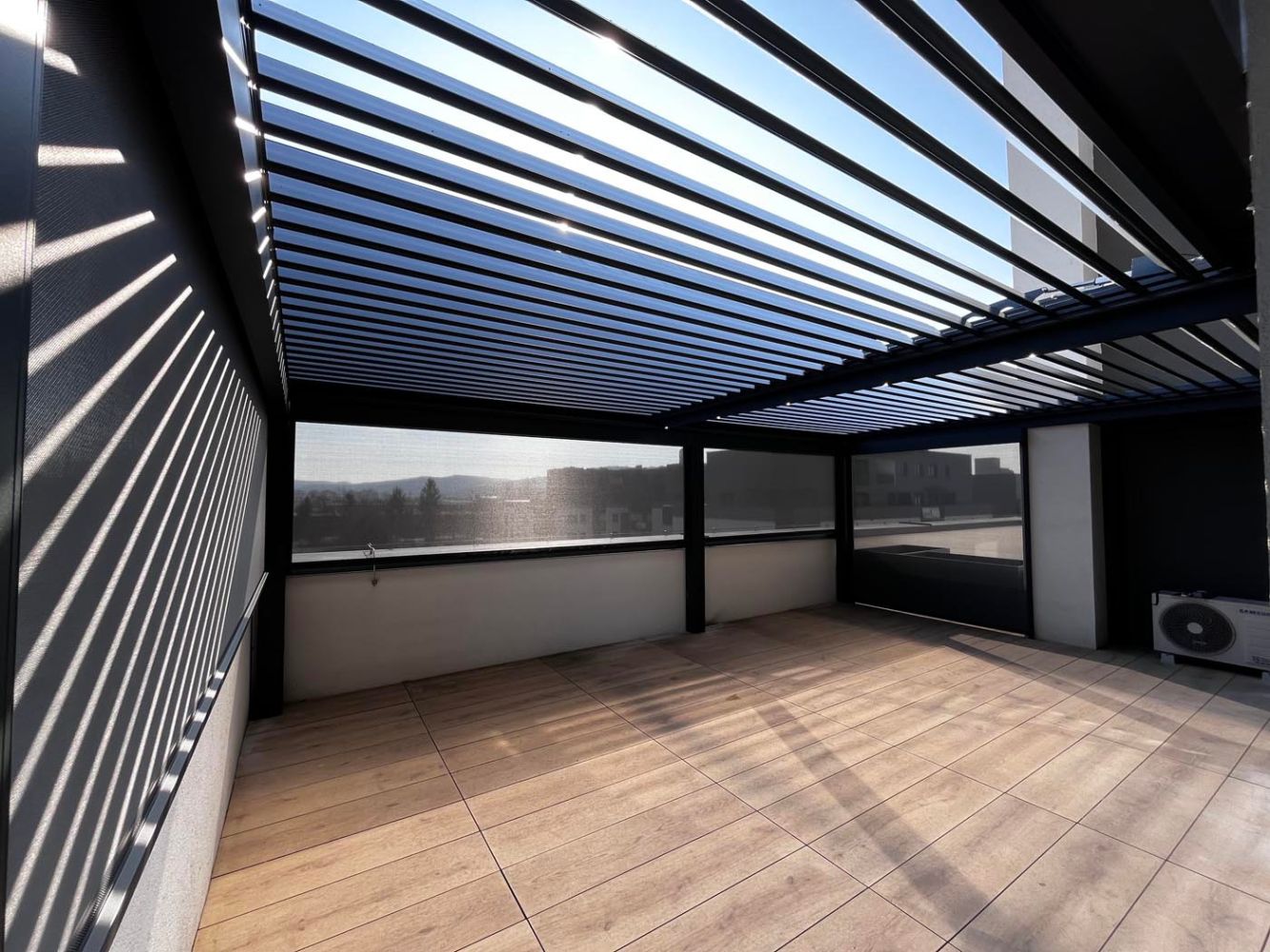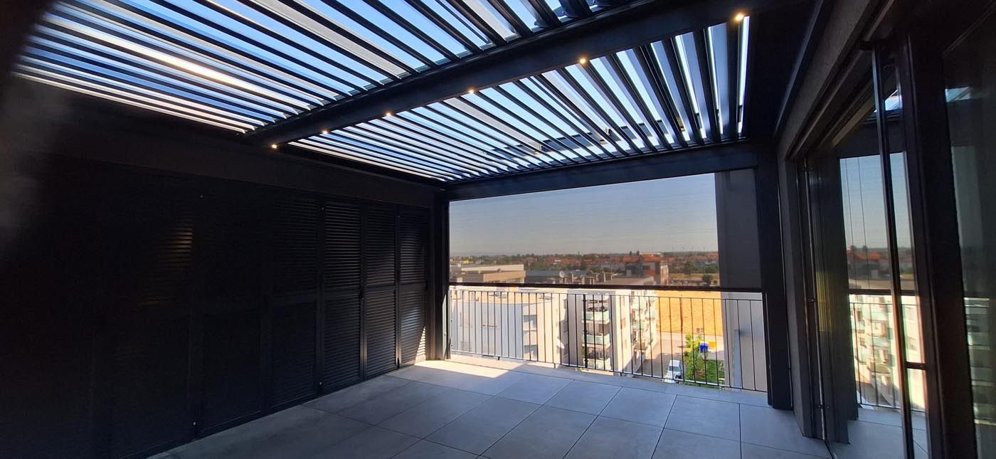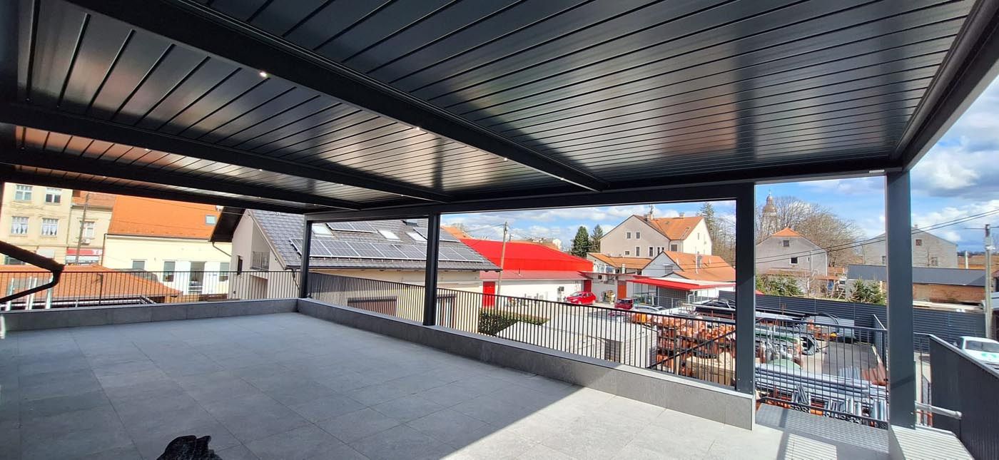 Na terasi novega stanovanjskega bloka v hrvaški prestolnici je postavljena elegantna bioklimatska pergola v antracitnem odtenku (RAL 7016), ki s svojo sodobno zasnovo dopolnjuje arhitekturo objekta in ustvarja prijeten zunanji prostor za bivanje.