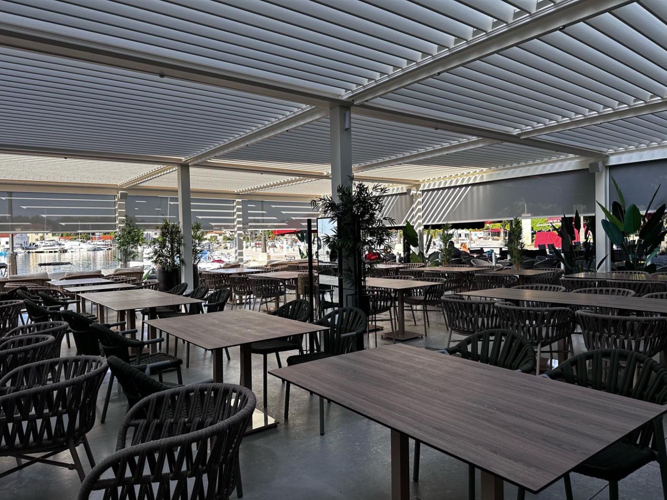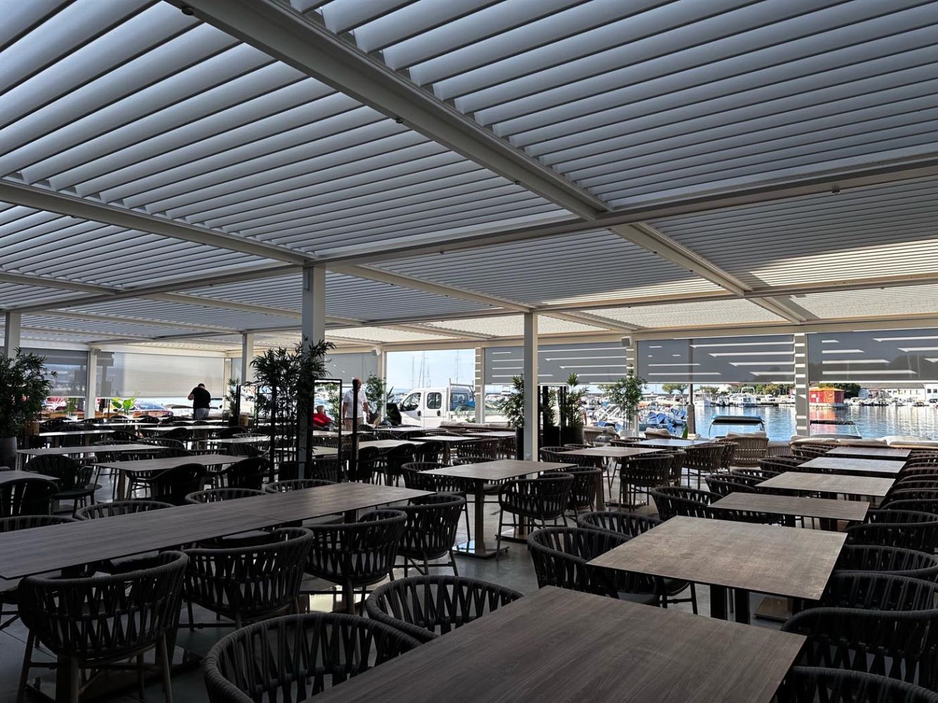 Pergola v elegantni beli barvi (RAL 9010) ustvarja svež, moderen videz, ki se popolno ujema z mediteranskim okoljem ter prispeva k zračnemu, sproščenemu vzdušju, ki je idealno za obmorsko restavracijo.