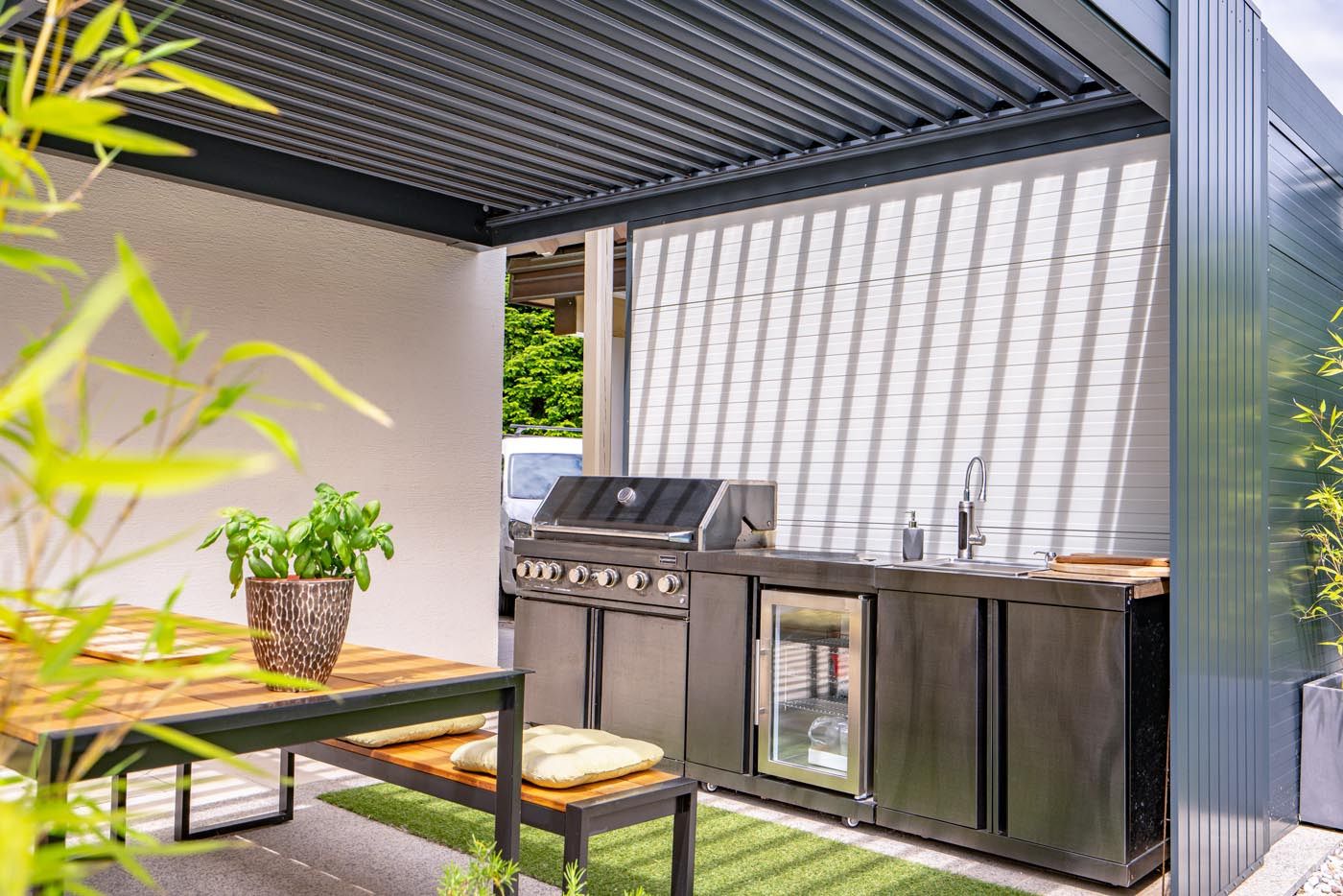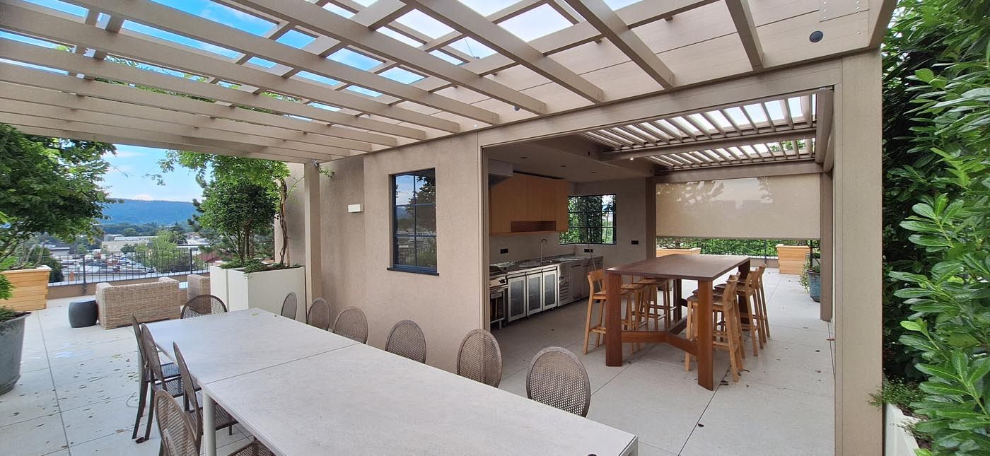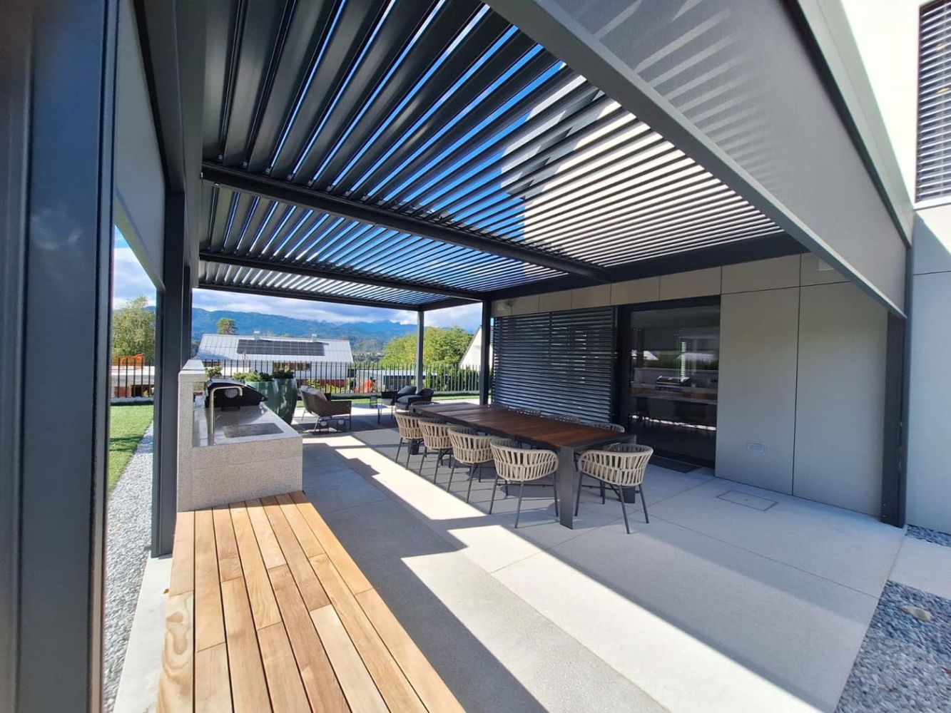 Poleg senčenja in zaščite pred dežjem pergola služi tudi kot pokritje za letno kuhinjo, s čimer omogoča uporabo zunanjega prostora skozi vse leto.